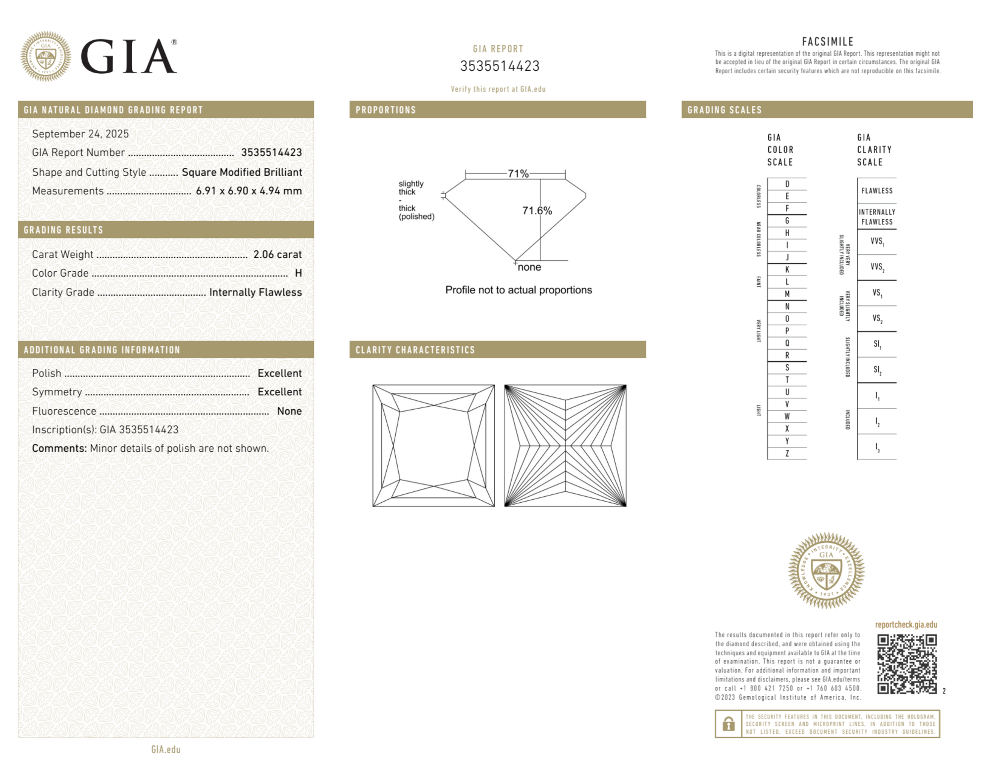 Your 2.06 carat Princess natural diamond is graded H color (Near Colorless), and you can read more about H color diamonds here.