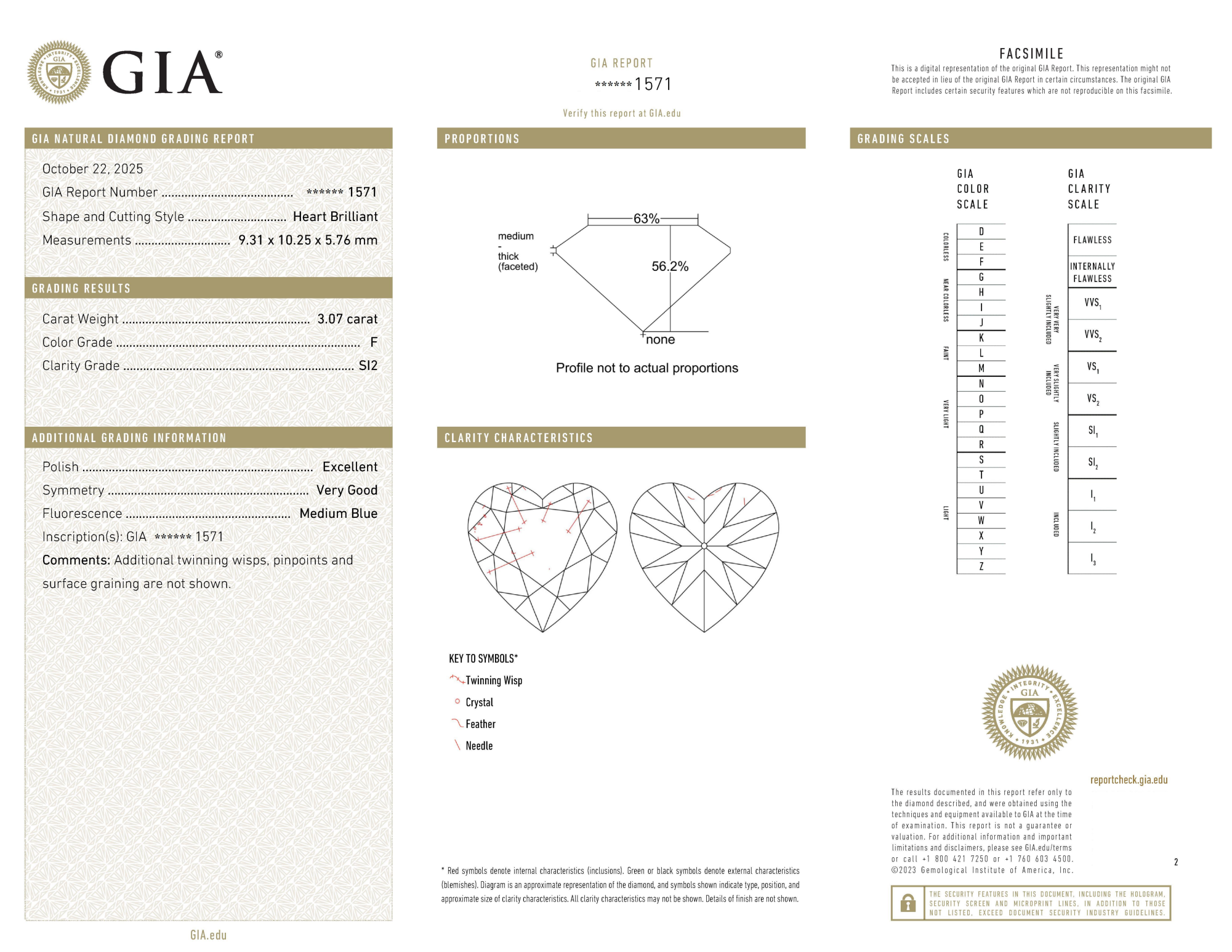 Your 3.07 carat Heart natural diamond is graded F color (Colorless), and you can read more about F color diamonds here.
