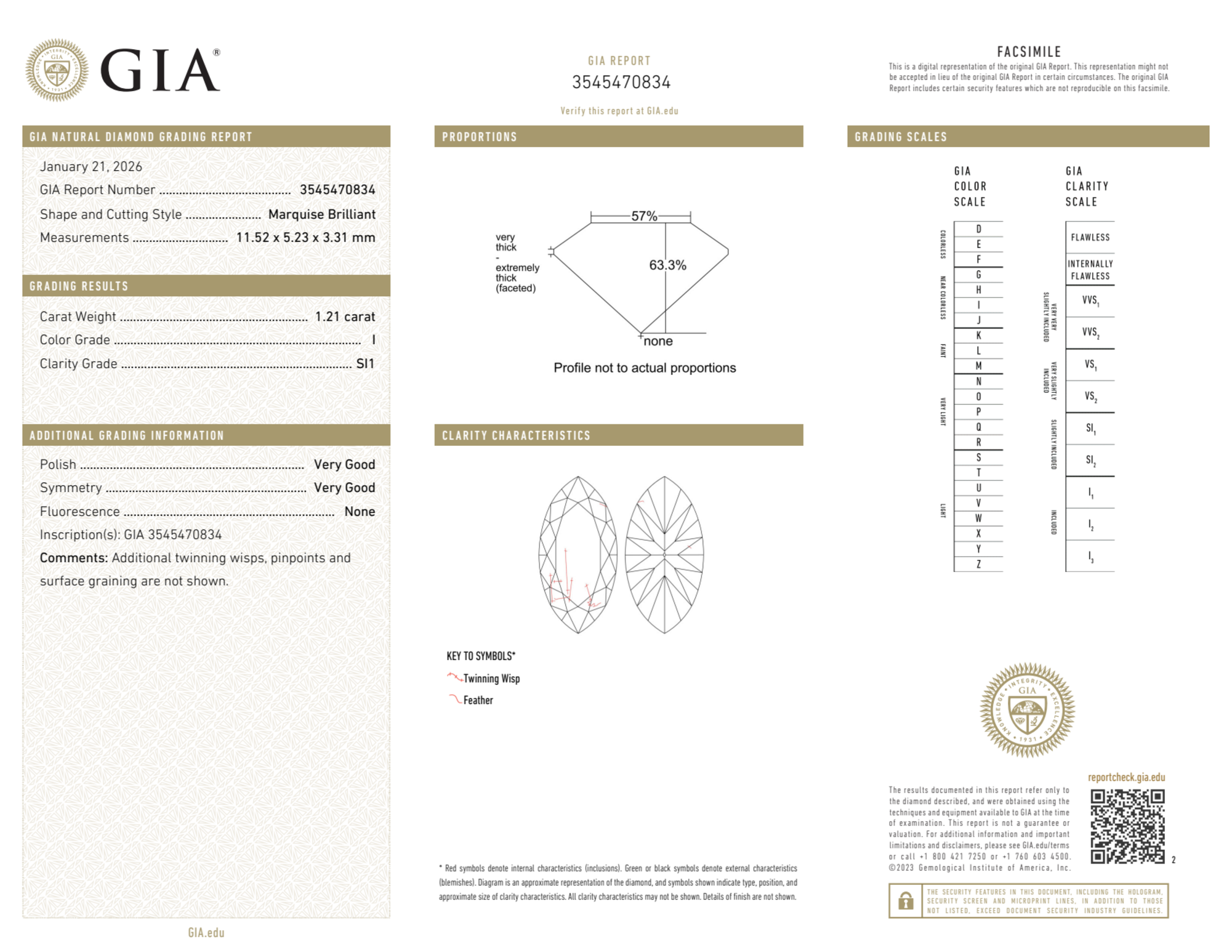 Your 1.21 carat Marquise natural diamond is graded SI1 clarity, which stands for Slightly Included 1. Read more about SI1 clarity diamonds here, or learn more about diamond clarity in general here.