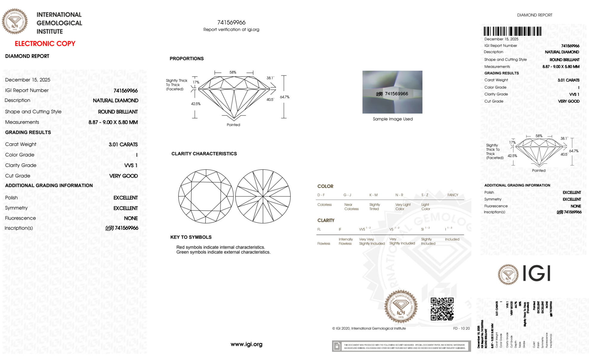 Your 3.01 carat Round natural diamond is graded VVS1 clarity, which stands for Very Very Slightly Included 1. Read more about VVS1 clarity diamonds here, or learn more about diamond clarity in general here.