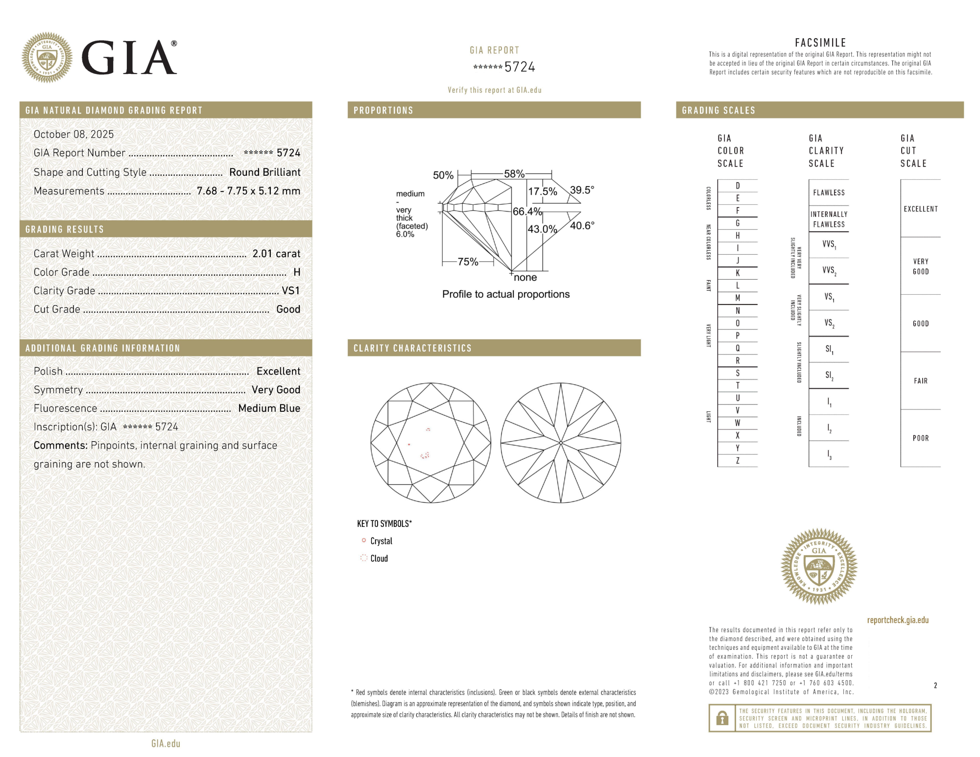 Your 2.01 carat Round natural diamond is graded H color (Near Colorless), and you can read more about H color diamonds here.