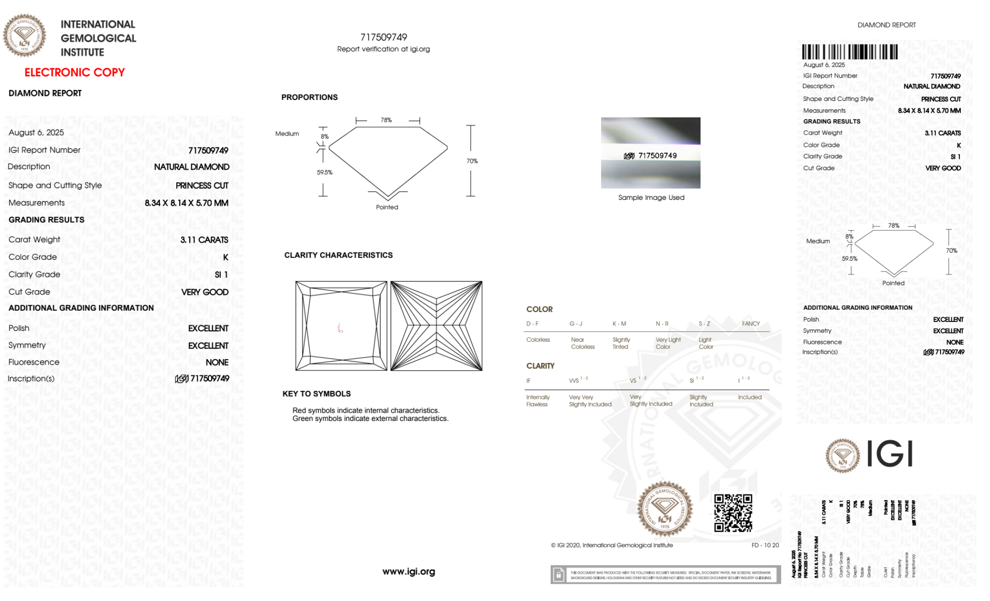 Your 3.11 carat Princess natural diamond is graded SI1 clarity, which stands for Slightly Included 1. Read more about SI1 clarity diamonds here, or learn more about diamond clarity in general here.