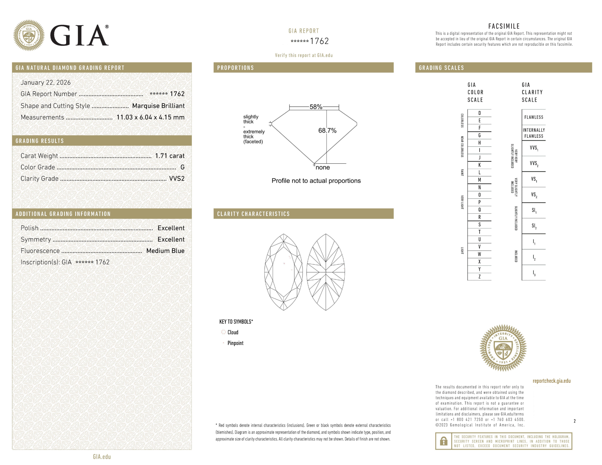 Your 1.71 carat Marquise natural diamond is graded VVS2 clarity, which stands for Very Very Slightly Included 2. Read more about VVS2 clarity diamonds here, or learn more about diamond clarity in general here.