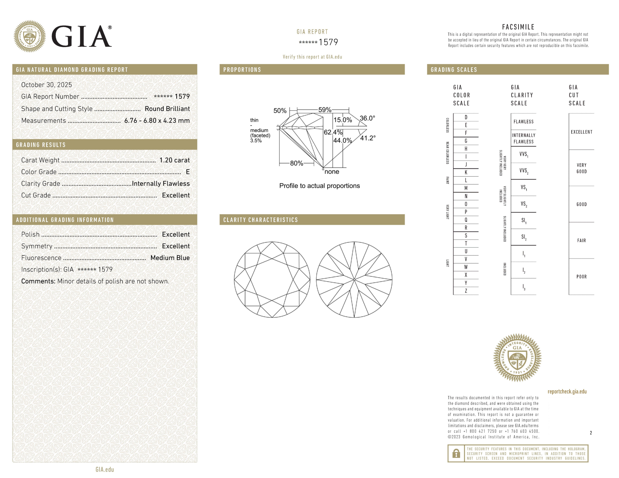 Your 1.20 carat Round natural diamond is graded E color (Colorless), and you can read more about E color diamonds here.