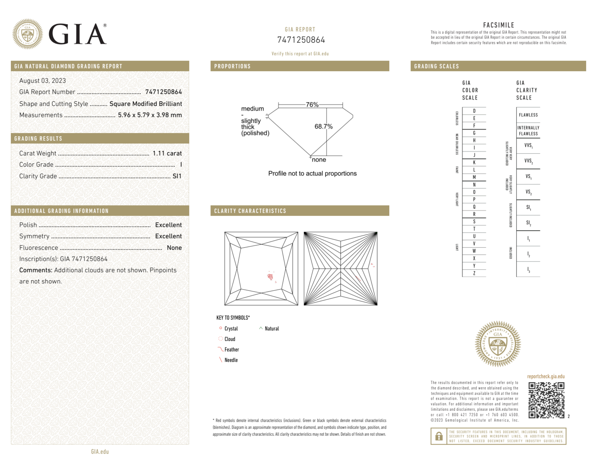 Your 1.11 carat Princess natural diamond is graded SI1 clarity, which stands for Slightly Included 1. Read more about SI1 clarity diamonds here, or learn more about diamond clarity in general here.