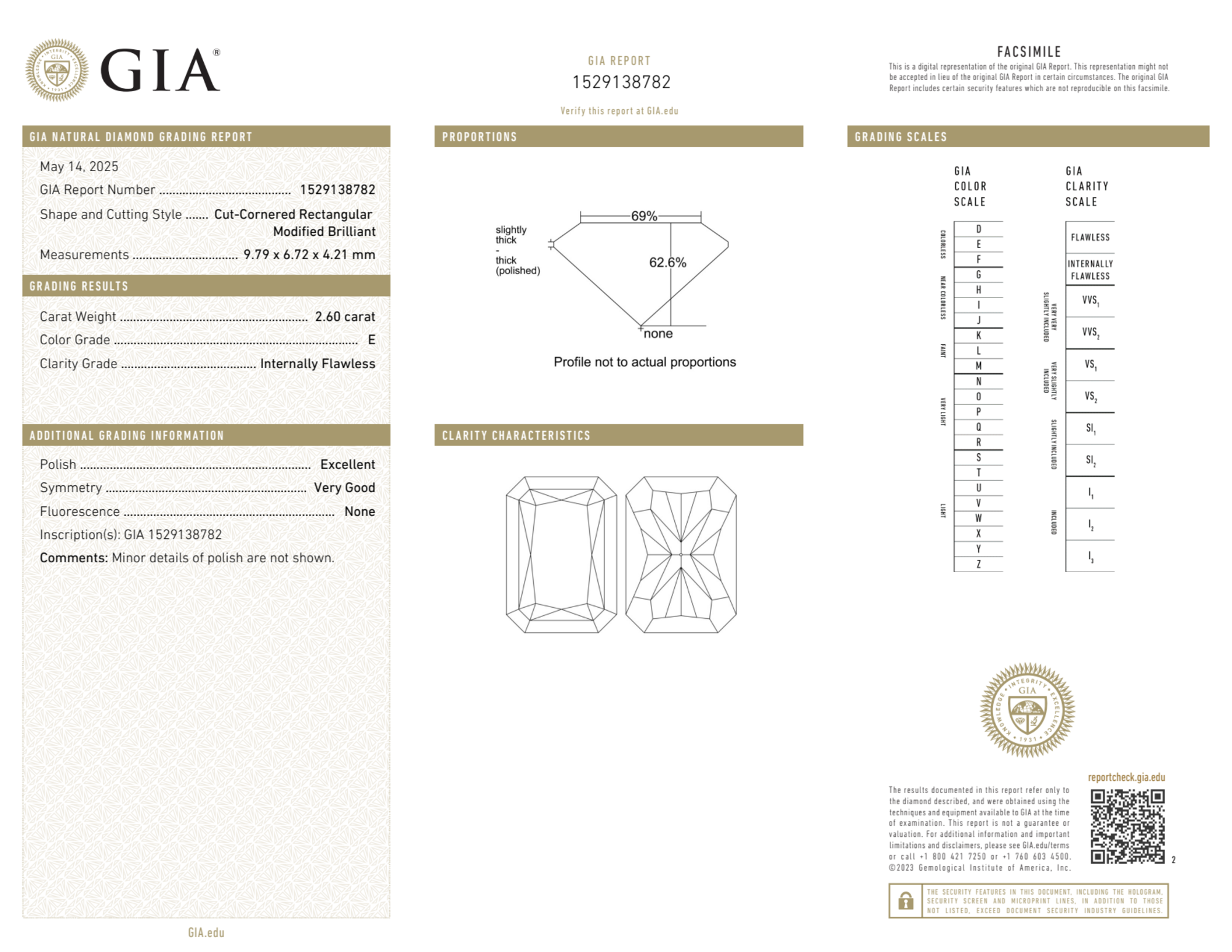 Your 2.60 carat Radiant natural diamond is graded E color (Colorless), and you can read more about E color diamonds here.