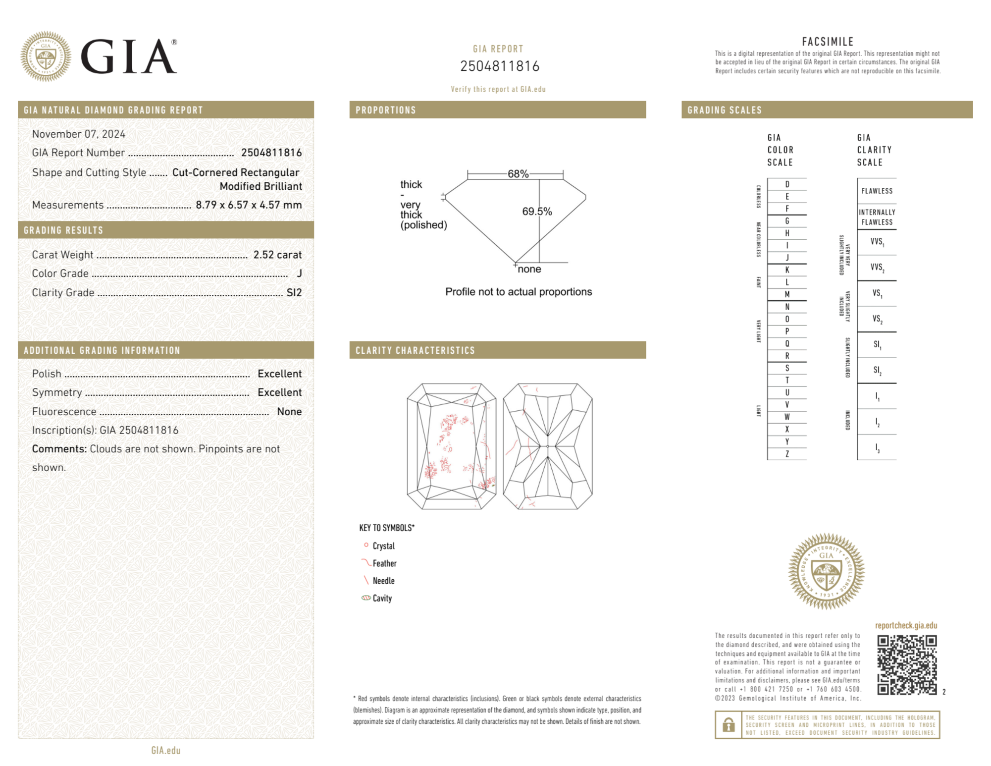 Your 2.52 carat Radiant natural diamond is graded J color (Near Colorless), and you can read more about J color diamonds here.
