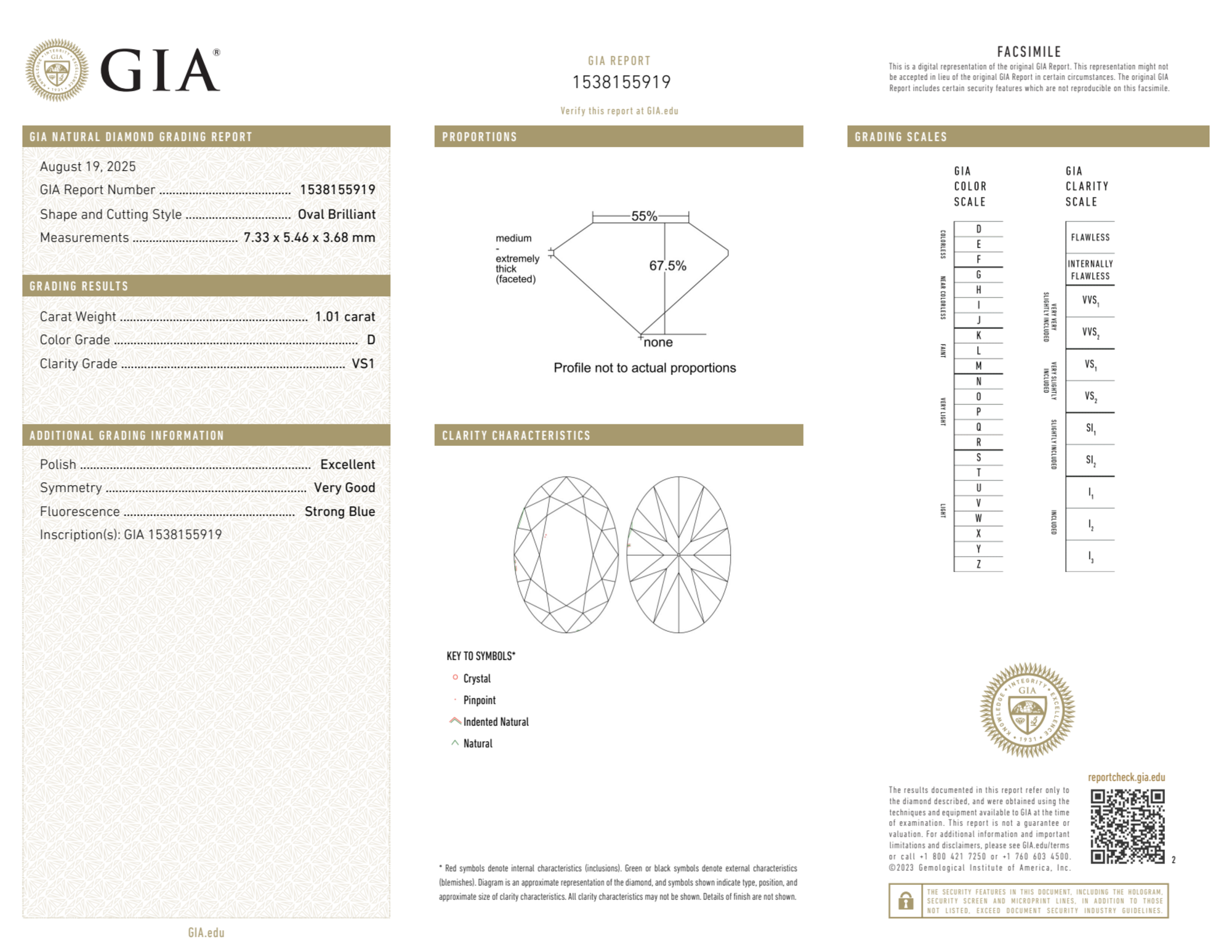Your 1.01 carat Oval natural diamond is graded VS1 clarity, which stands for Very Slightly Included 1. Read more about VS1 clarity diamonds here, or learn more about diamond clarity in general here.