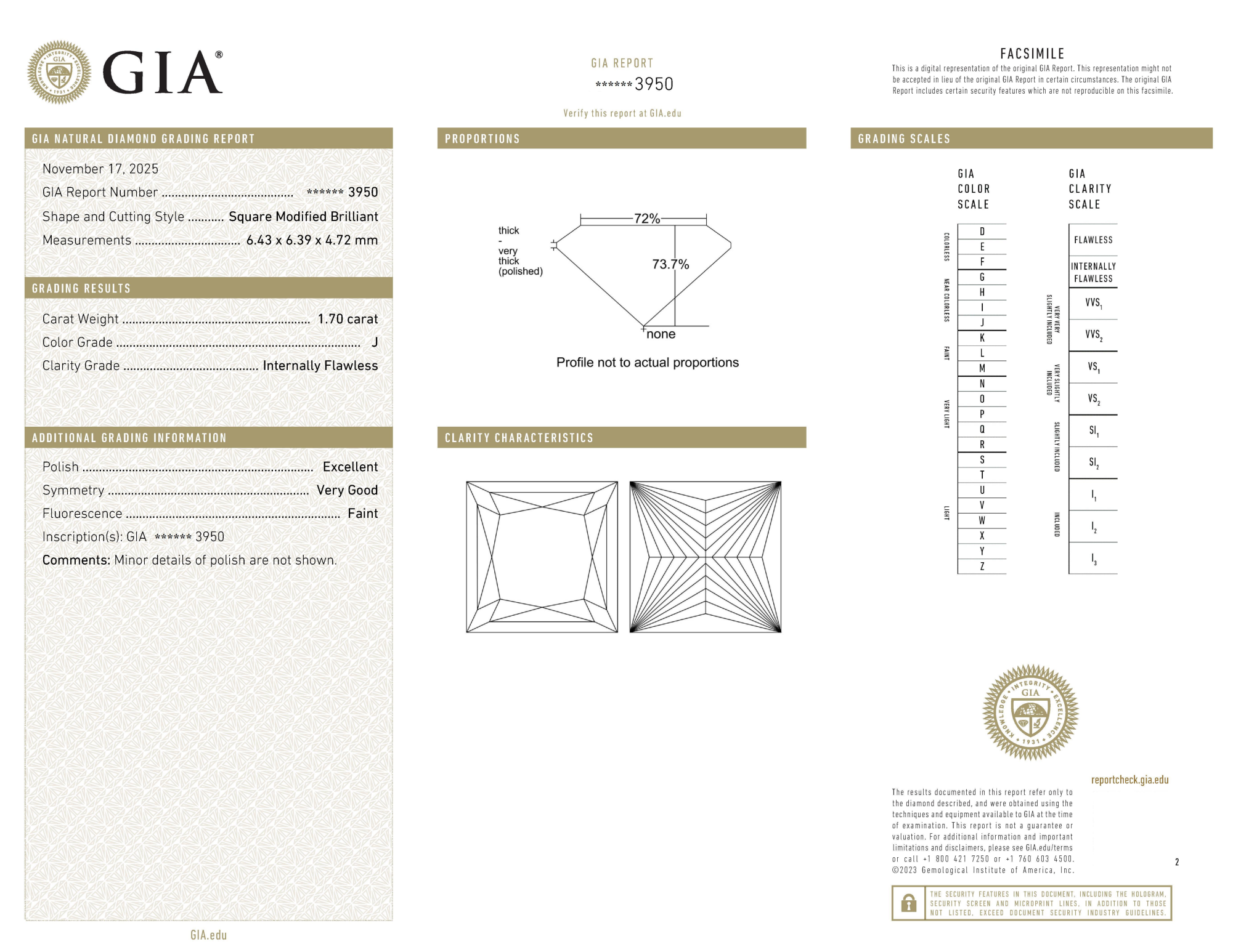 Your 1.70 carat Princess natural diamond is graded J color (Near Colorless), and you can read more about J color diamonds here.