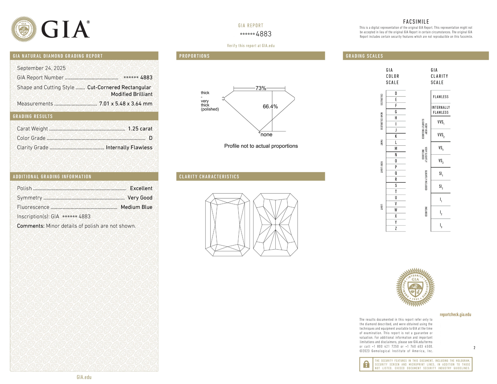Your 1.25 carat Radiant natural diamond is graded IF clarity, which stands for Internally Flawless. Read more about IF clarity diamonds here, or learn more about diamond clarity in general here.