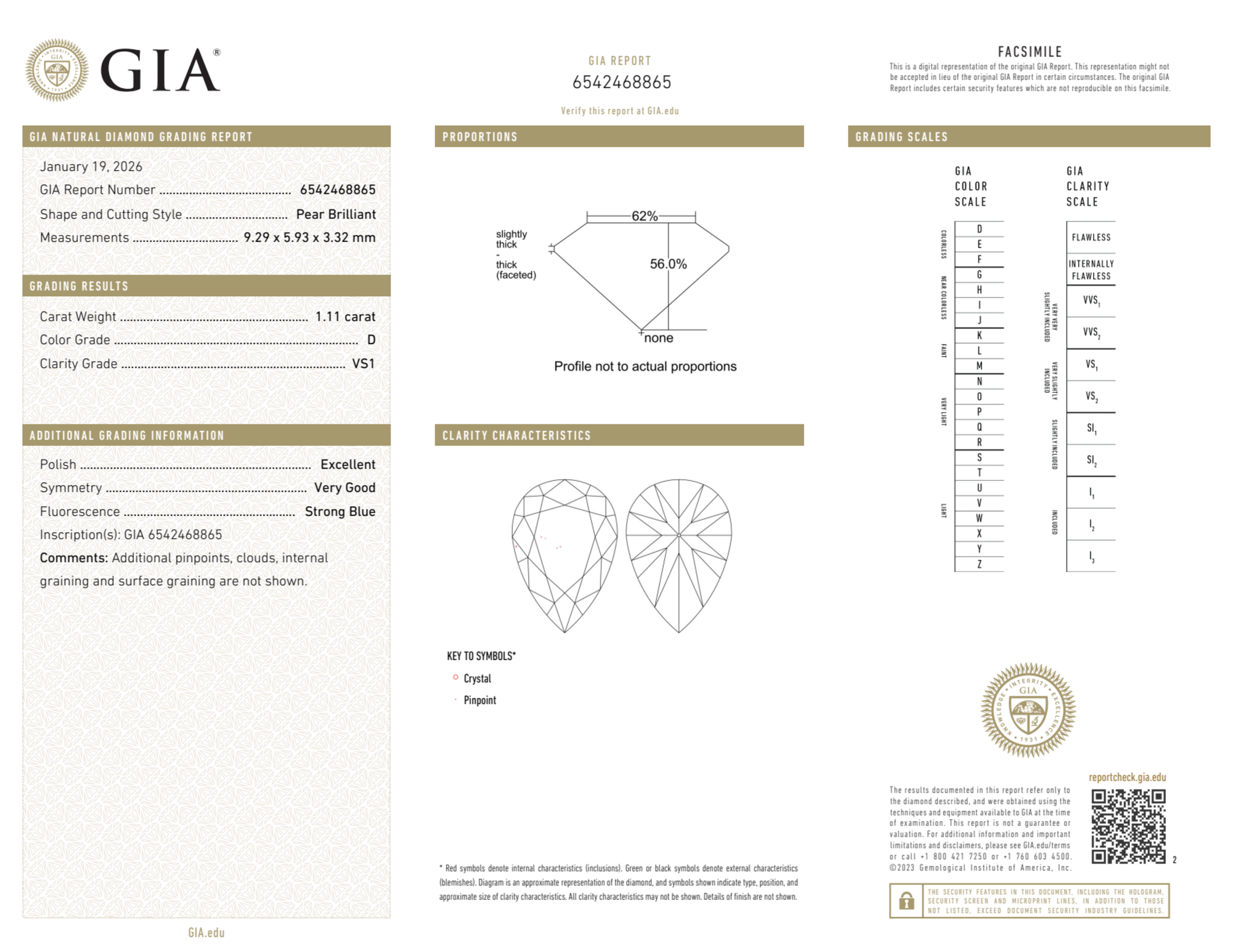 Your 1.11 carat Pear natural diamond is graded D color (Colorless), and you can read more about D color diamonds here.
