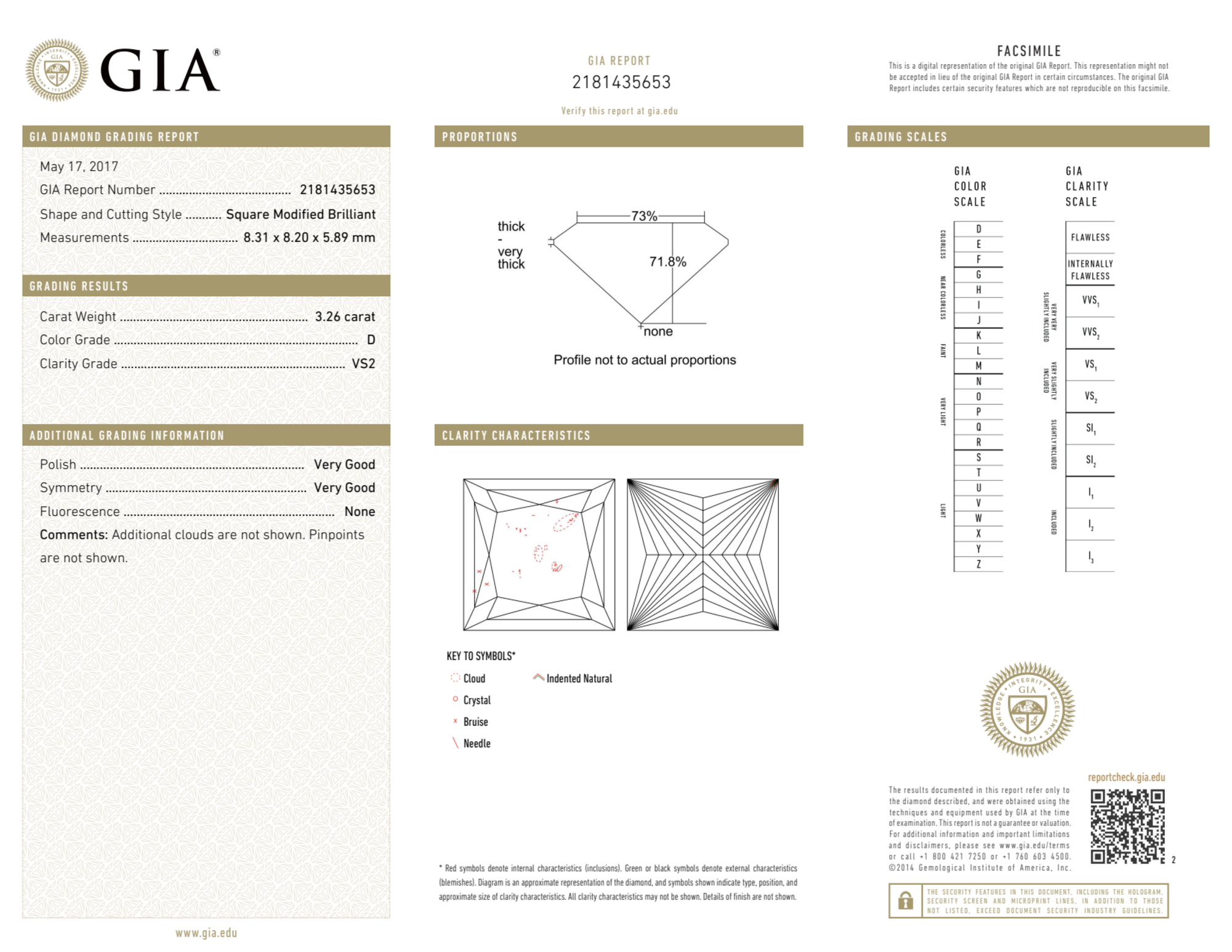 Your 3.26 carat Princess natural diamond is graded D color (Colorless), and you can read more about D color diamonds here.