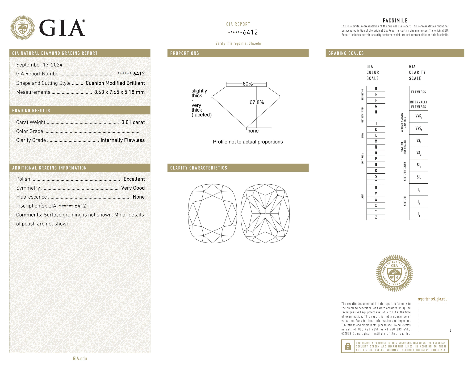 Your 3.01 carat Cushion natural diamond is graded IF clarity, which stands for Internally Flawless. Read more about IF clarity diamonds here, or learn more about diamond clarity in general here.
