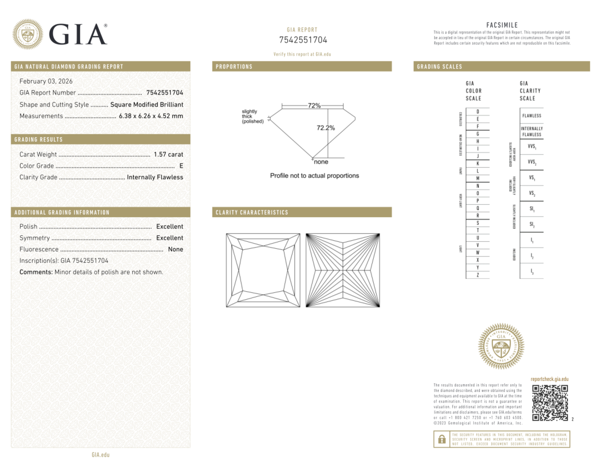 Your 1.57 carat Princess natural diamond is graded E color (Colorless), and you can read more about E color diamonds here.