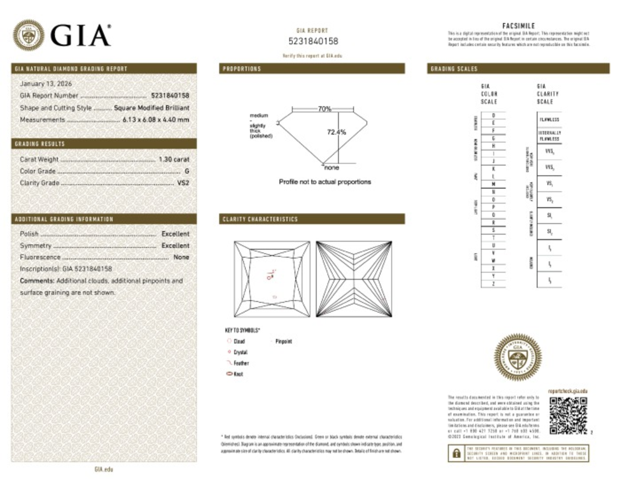Your 1.30 carat Princess natural diamond is graded VS2 clarity, which stands for Very Slightly Included 2. Read more about VS2 clarity diamonds here, or learn more about diamond clarity in general here.