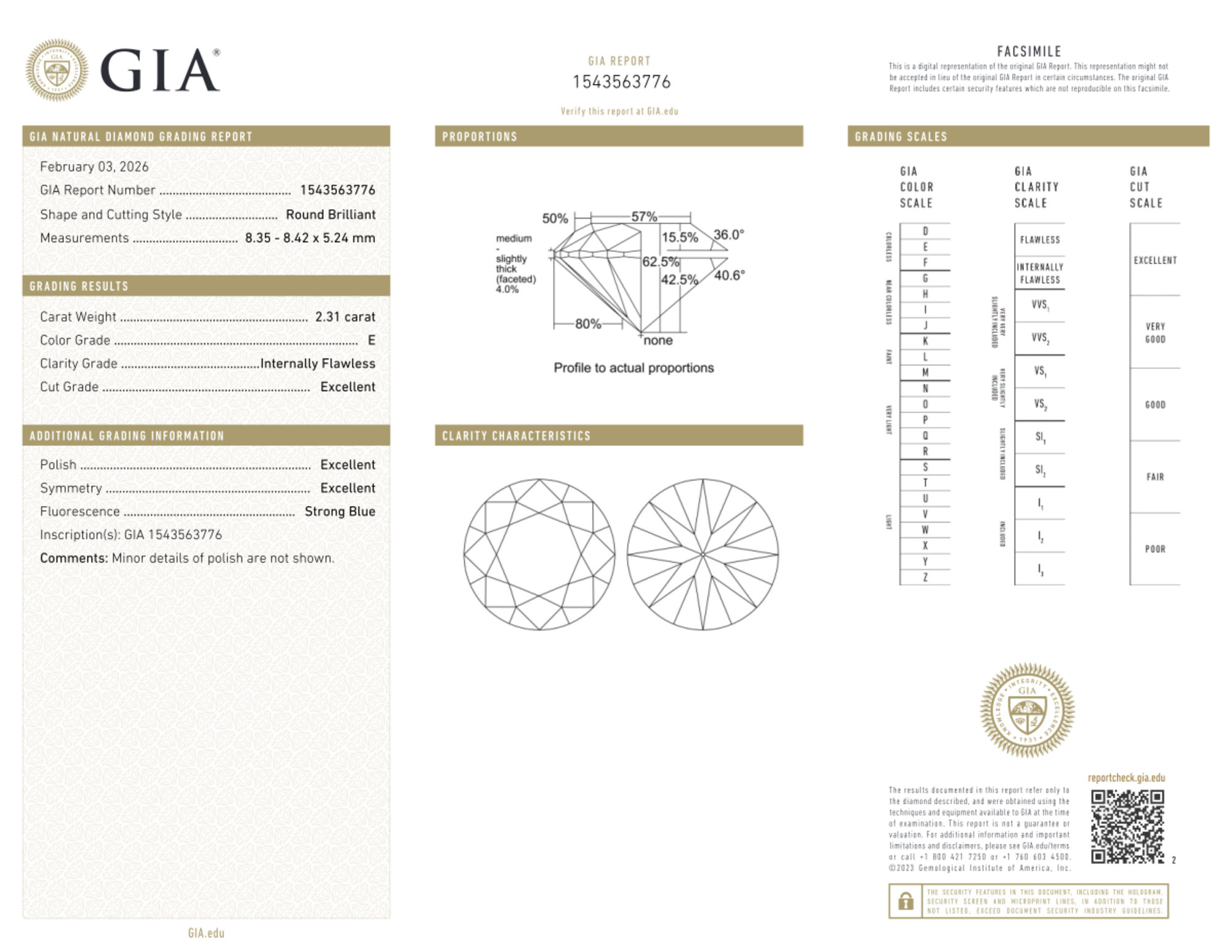 Your 2.31 carat Round natural diamond is graded IF clarity, which stands for Internally Flawless. Read more about IF clarity diamonds here, or learn more about diamond clarity in general here.