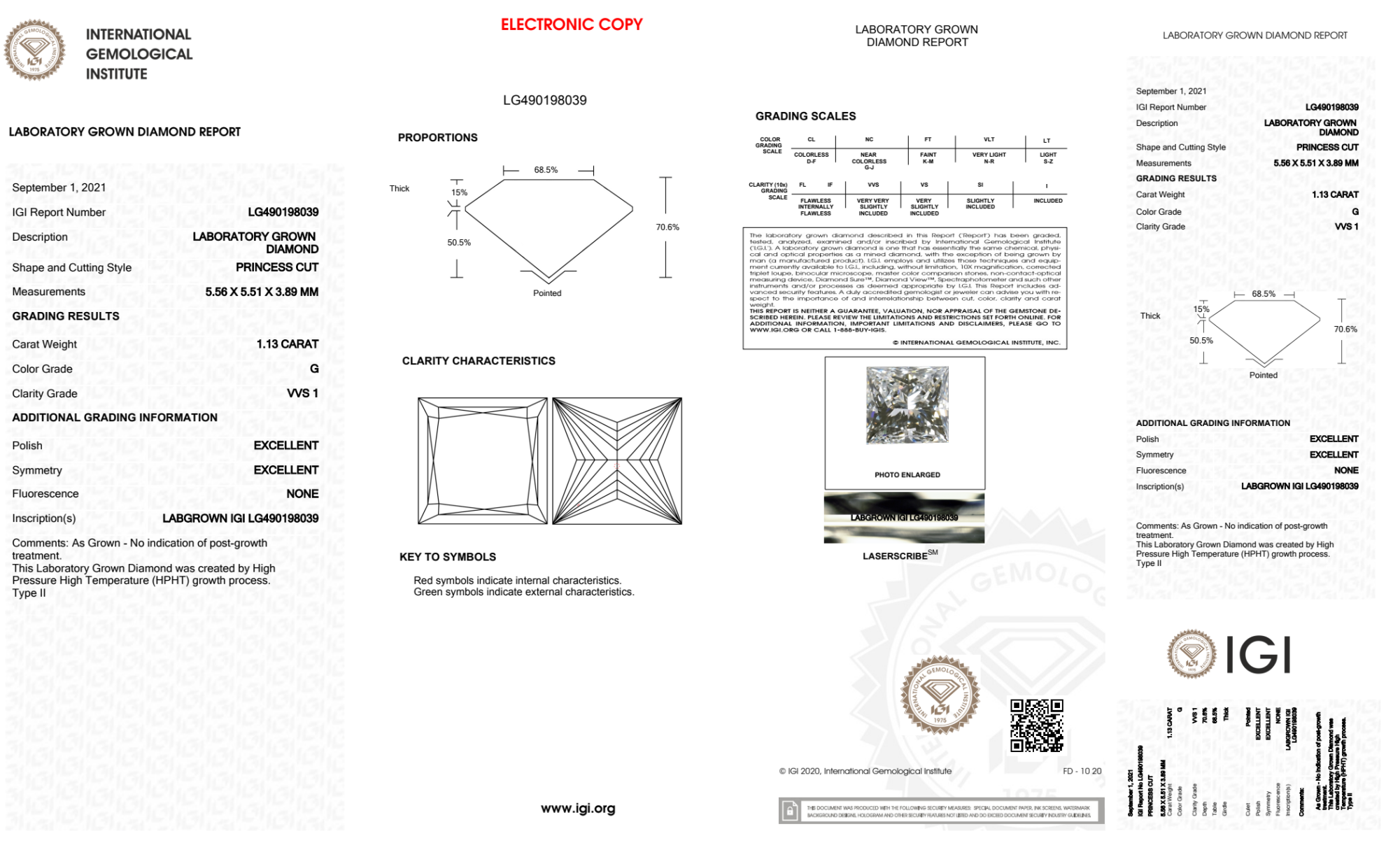 Your 1.13 carat Princess lab diamond is graded G color (Near Colorless), and you can read more about G color diamonds here.