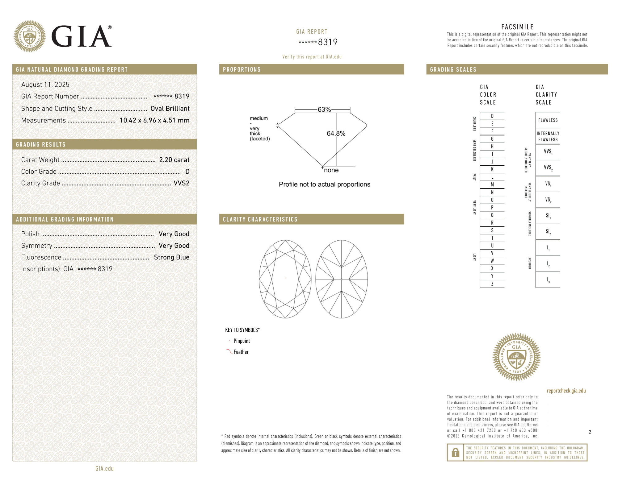 Your 2.20 carat Oval natural diamond is graded VVS2 clarity, which stands for Very Very Slightly Included 2. Read more about VVS2 clarity diamonds here, or learn more about diamond clarity in general here.