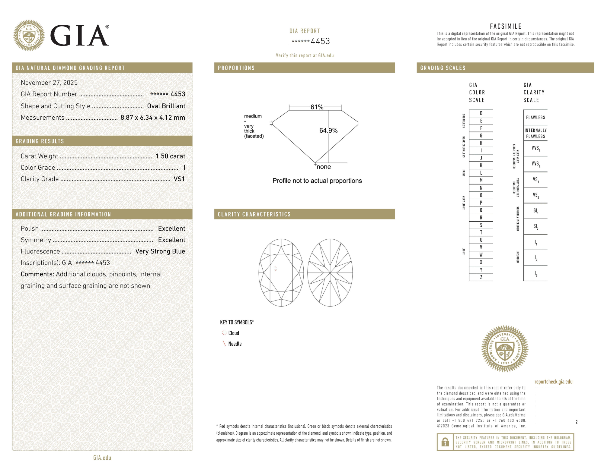 Your 1.50 carat Oval natural diamond is graded VS1 clarity, which stands for Very Slightly Included 1. Read more about VS1 clarity diamonds here, or learn more about diamond clarity in general here.