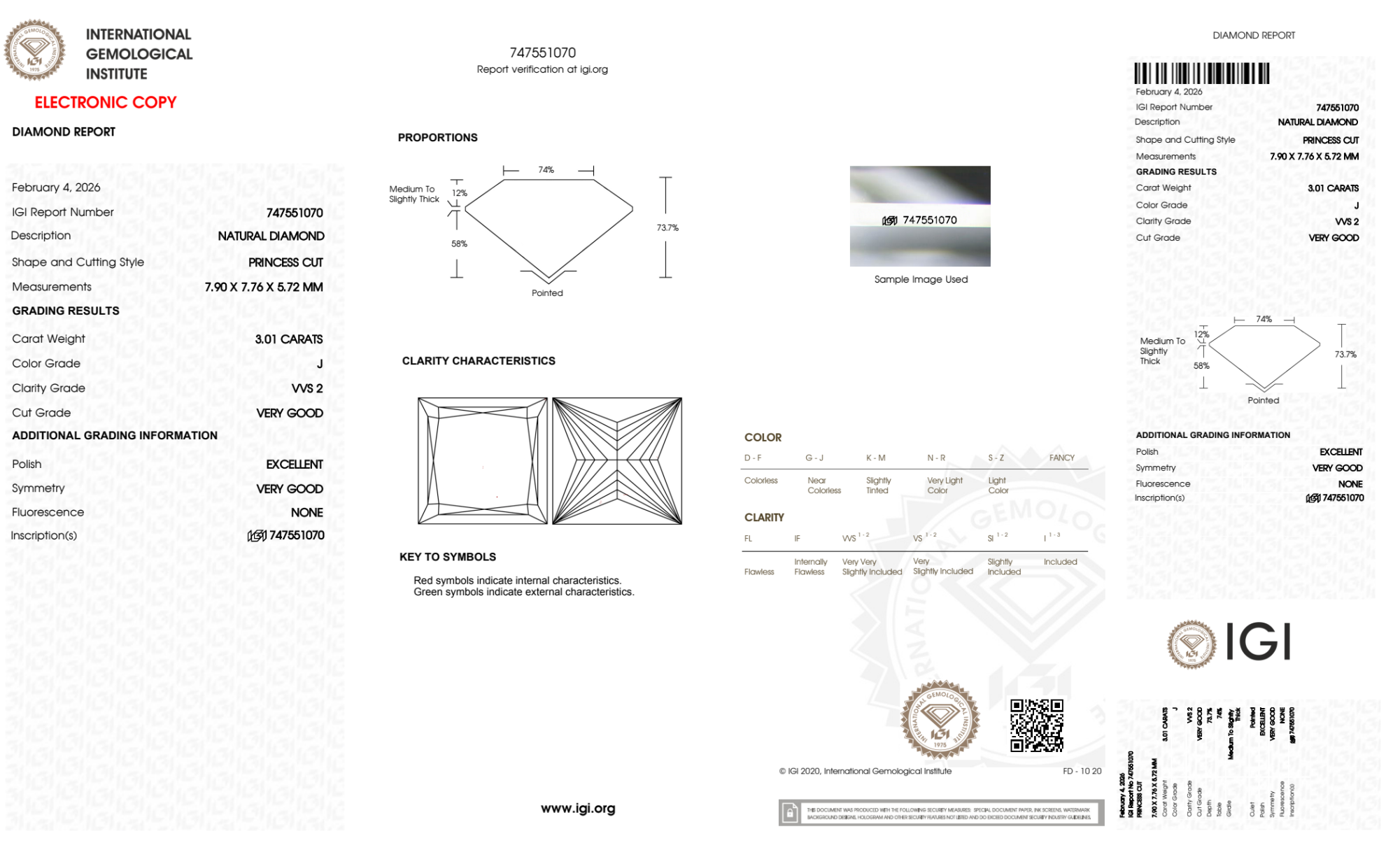 Your 3.01 carat Princess natural diamond is graded VVS2 clarity, which stands for Very Very Slightly Included 2. Read more about VVS2 clarity diamonds here, or learn more about diamond clarity in general here.