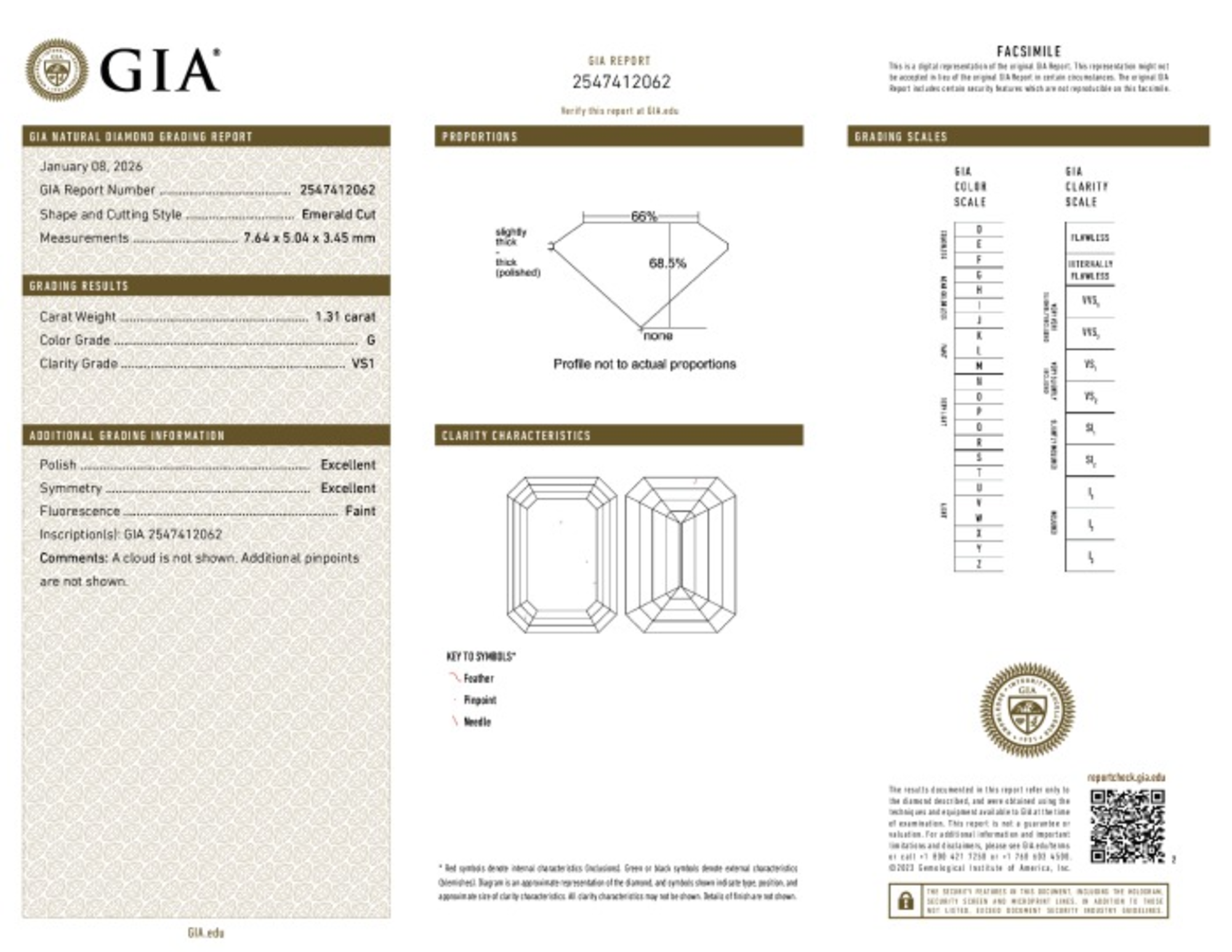 Your 1.31 carat Emerald natural diamond is graded VS1 clarity, which stands for Very Slightly Included 1. Read more about VS1 clarity diamonds here, or learn more about diamond clarity in general here.