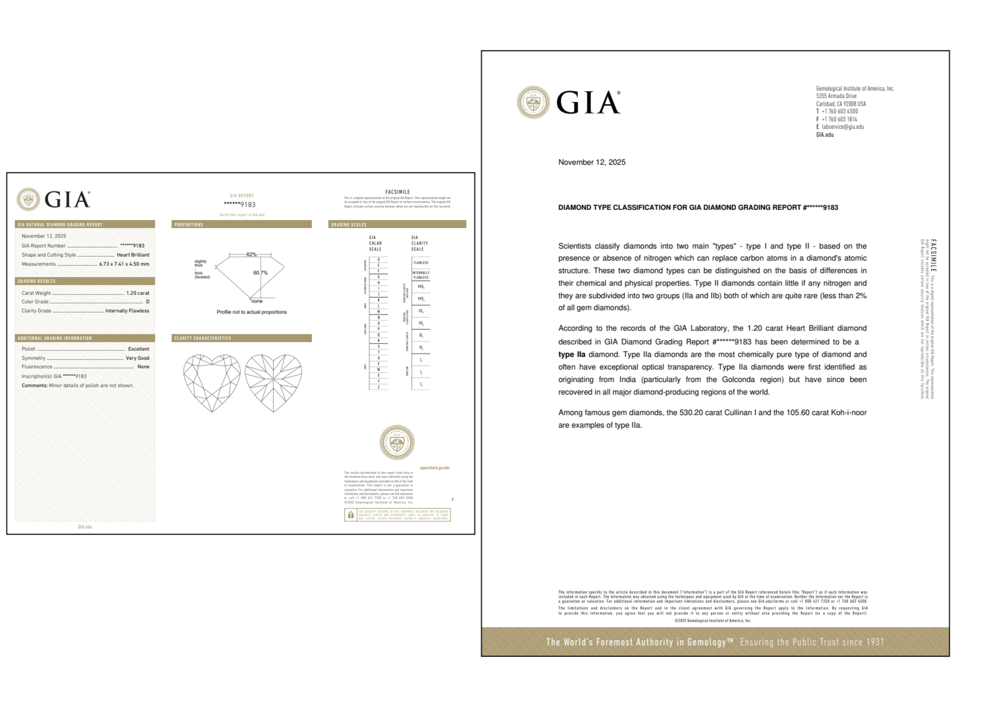 Your 1.20 carat Heart natural diamond is graded IF clarity, which stands for Internally Flawless. Read more about IF clarity diamonds here, or learn more about diamond clarity in general here.