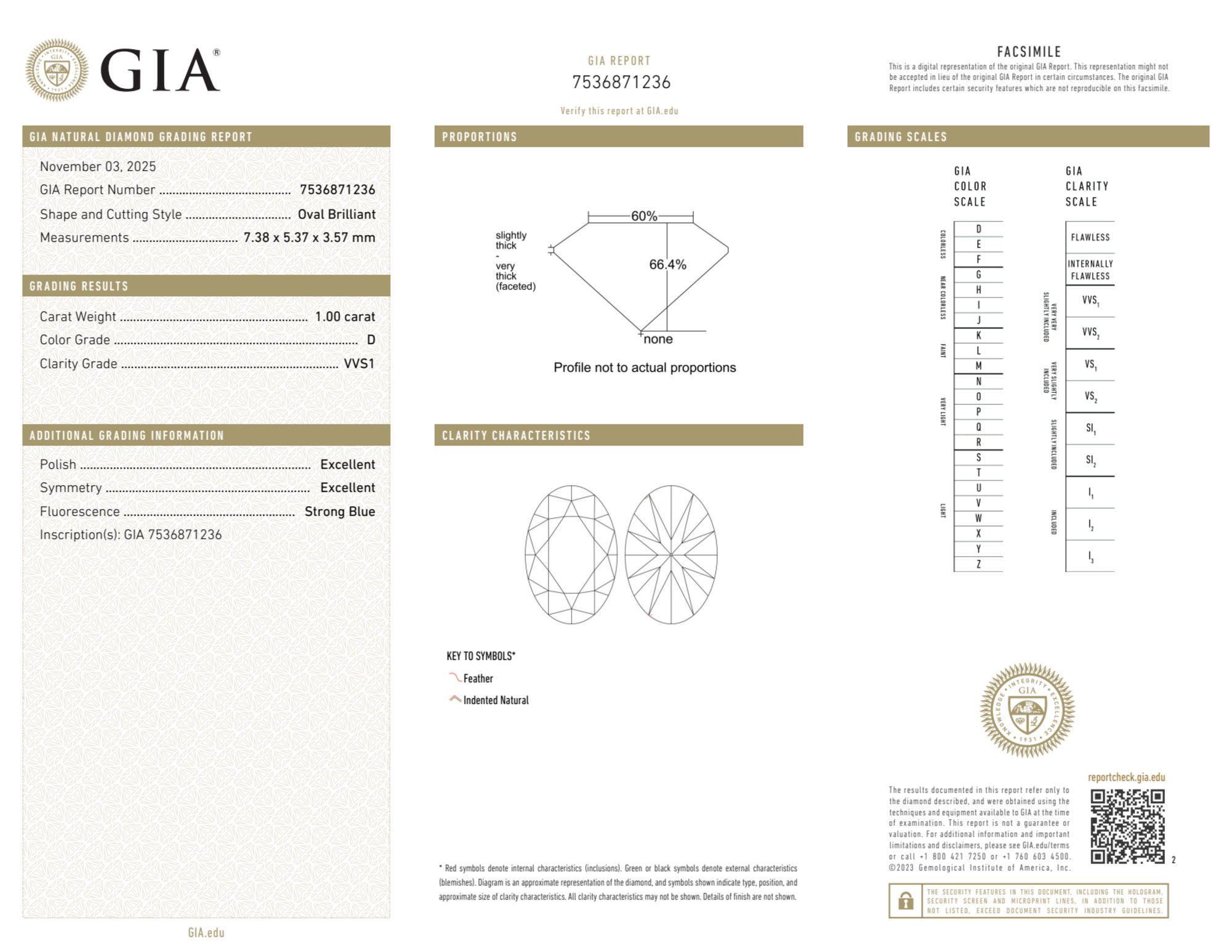 Your 1.00 carat Oval natural diamond is graded D color (Colorless), and you can read more about D color diamonds here.