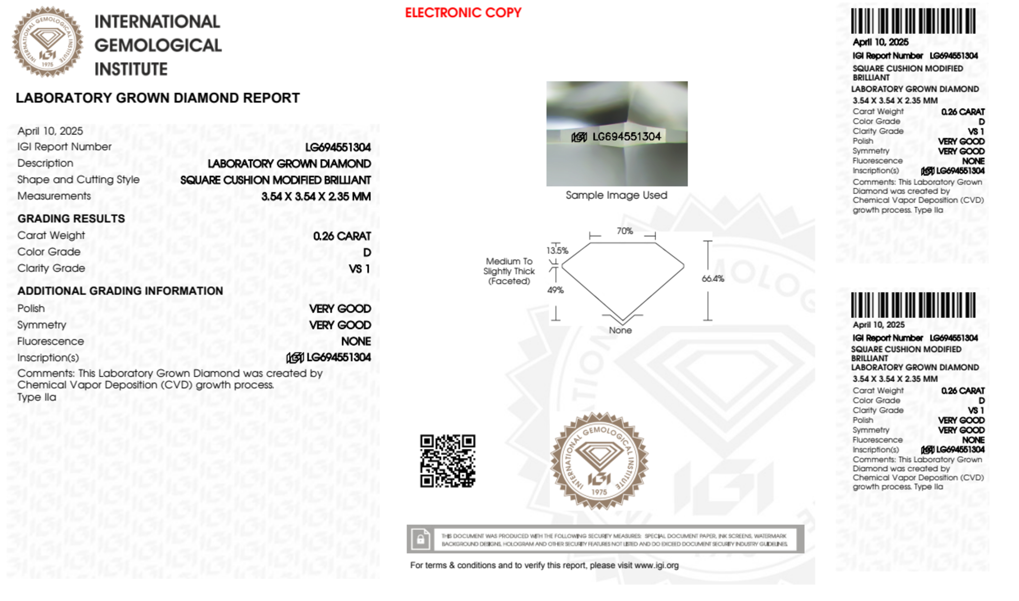 Your 0.26 carat Cushion lab diamond is graded VS1 clarity, which stands for Very Slightly Included 1. Read more about VS1 clarity diamonds here, or learn more about diamond clarity in general here.