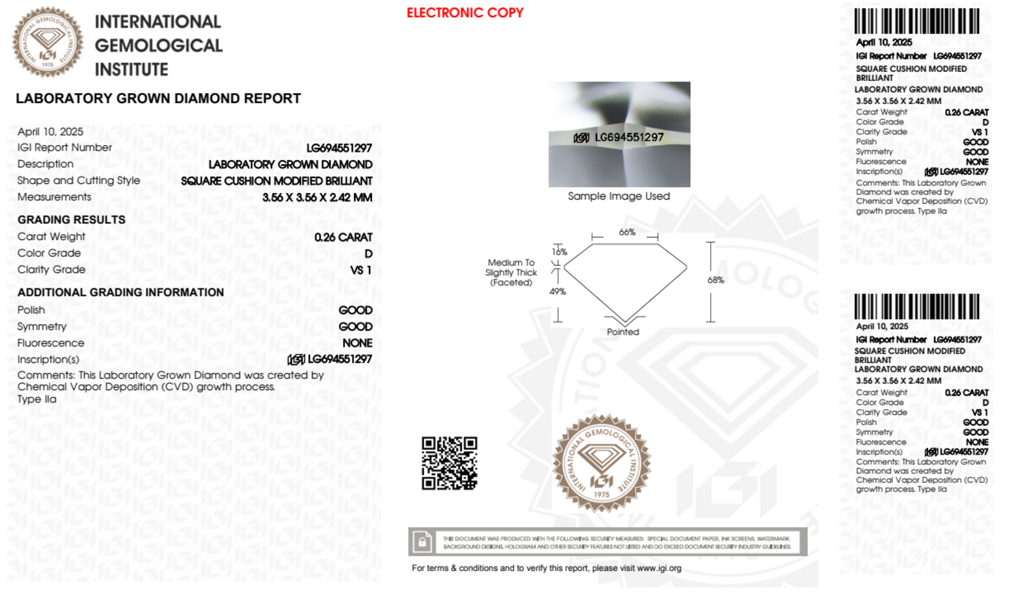 Your 0.26 carat Cushion lab diamond is graded D color (Colorless), and you can read more about D color diamonds here.