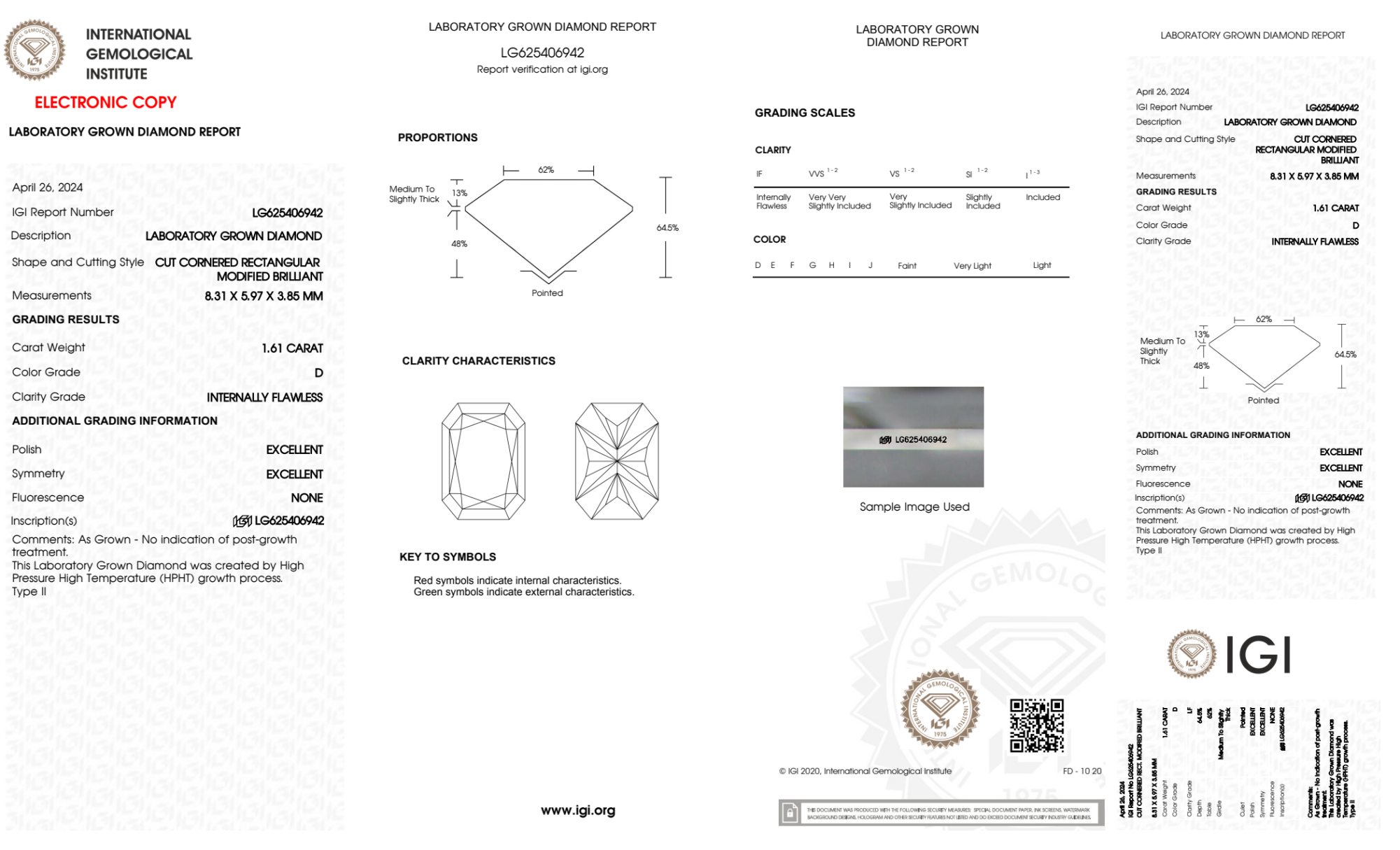 Your 1.61 carat Radiant lab diamond is graded D color (Colorless), and you can read more about D color diamonds here.