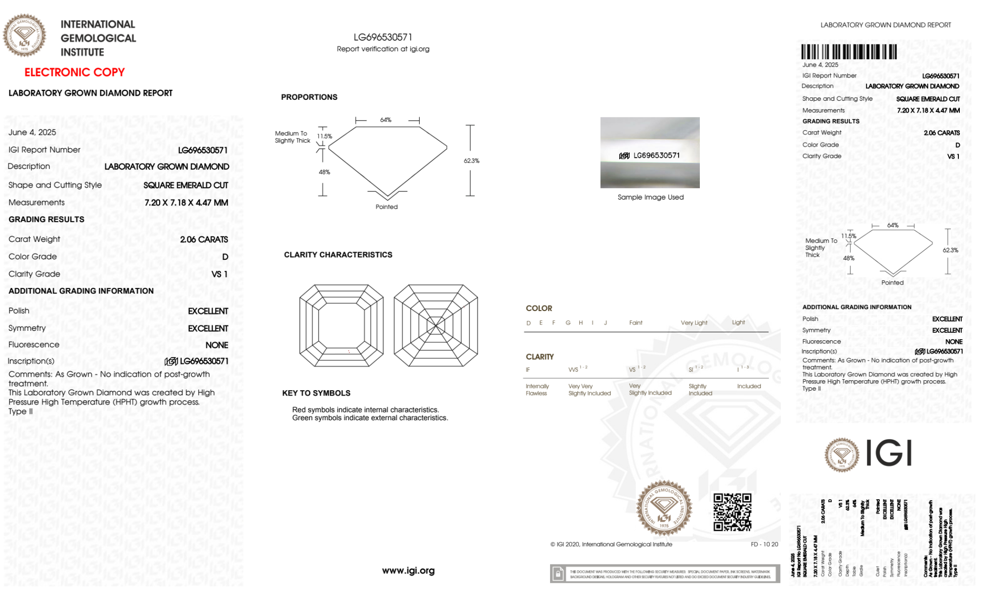 Your 2.06 carat Asscher lab diamond is graded D color (Colorless), and you can read more about D color diamonds here.