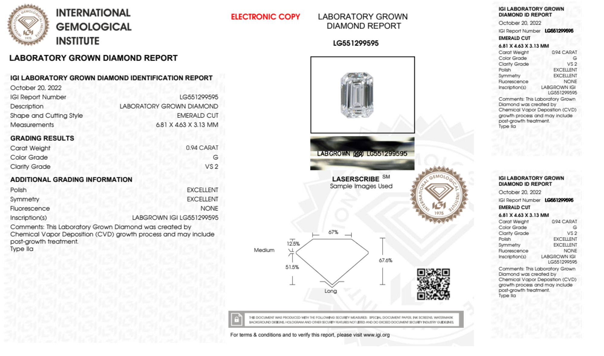 Your 0.94 carat Emerald lab diamond is graded G color (Near Colorless), and you can read more about G color diamonds here.