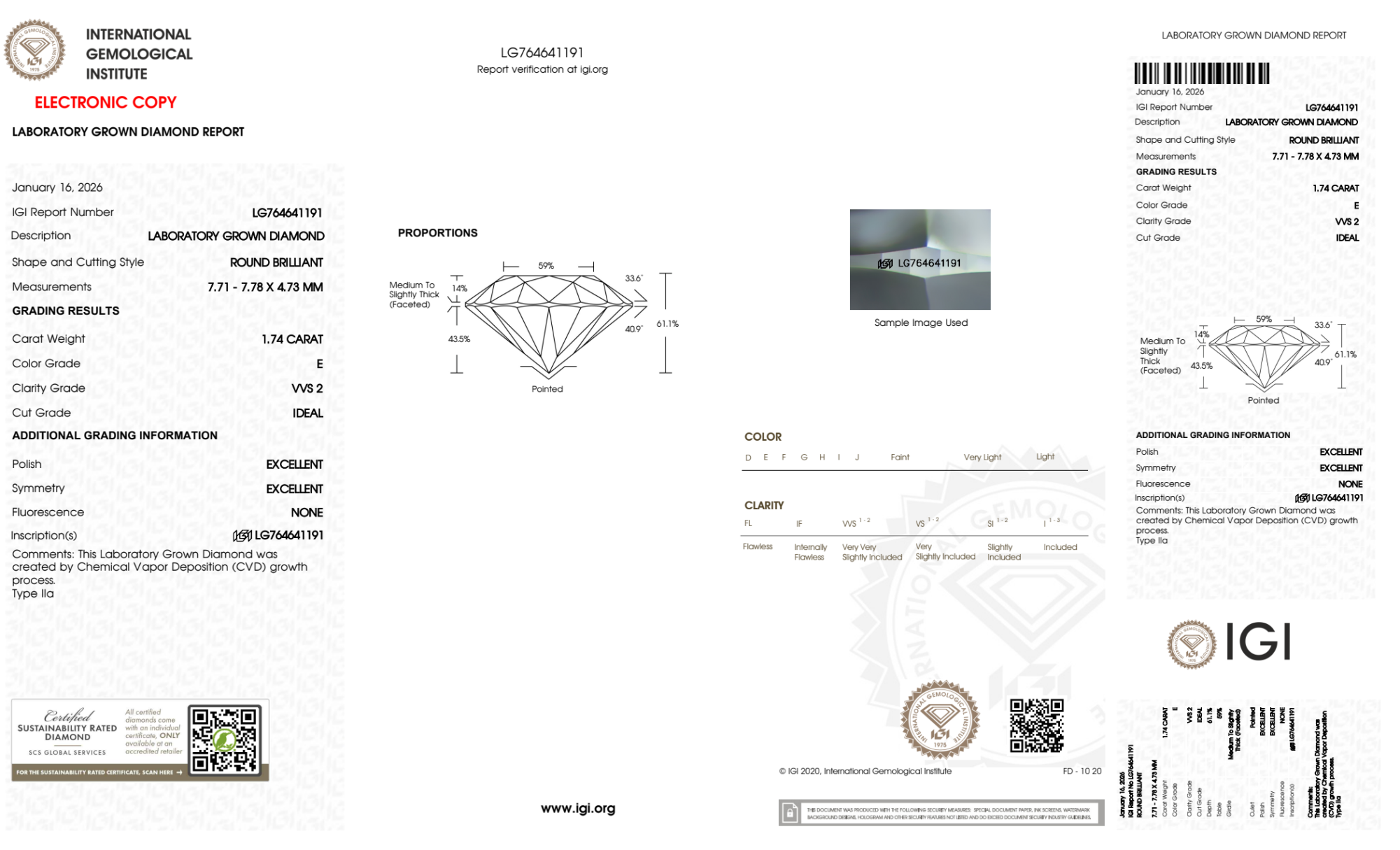 Your 1.74 carat Round lab diamond is graded E color (Colorless), and you can read more about E color diamonds here.