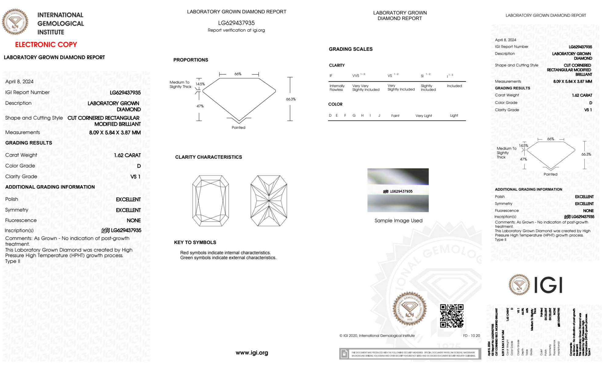 Your 1.62 carat Radiant lab diamond is graded D color (Colorless), and you can read more about D color diamonds here.