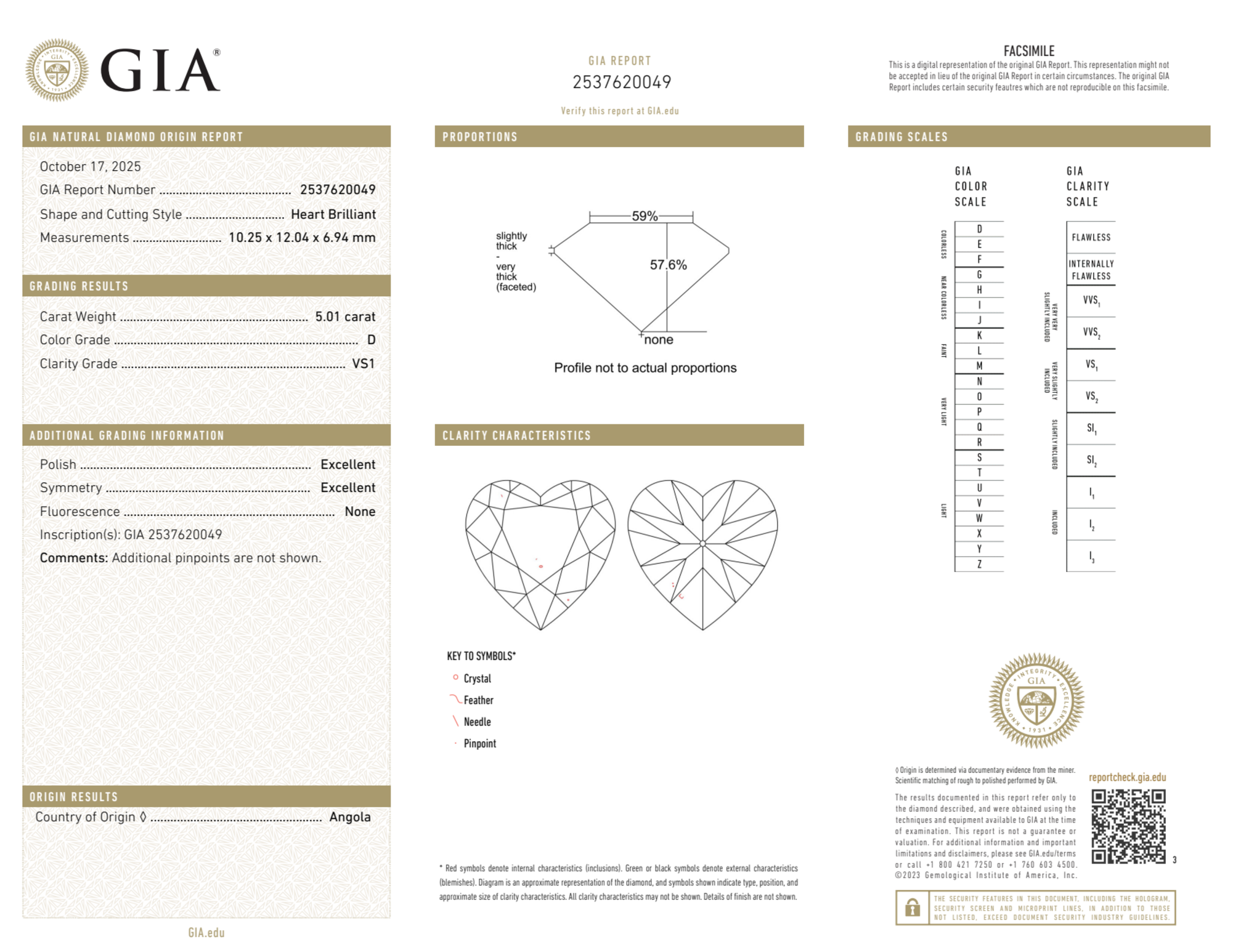 Your 5.01 carat Heart natural diamond is graded D color (Colorless), and you can read more about D color diamonds here.