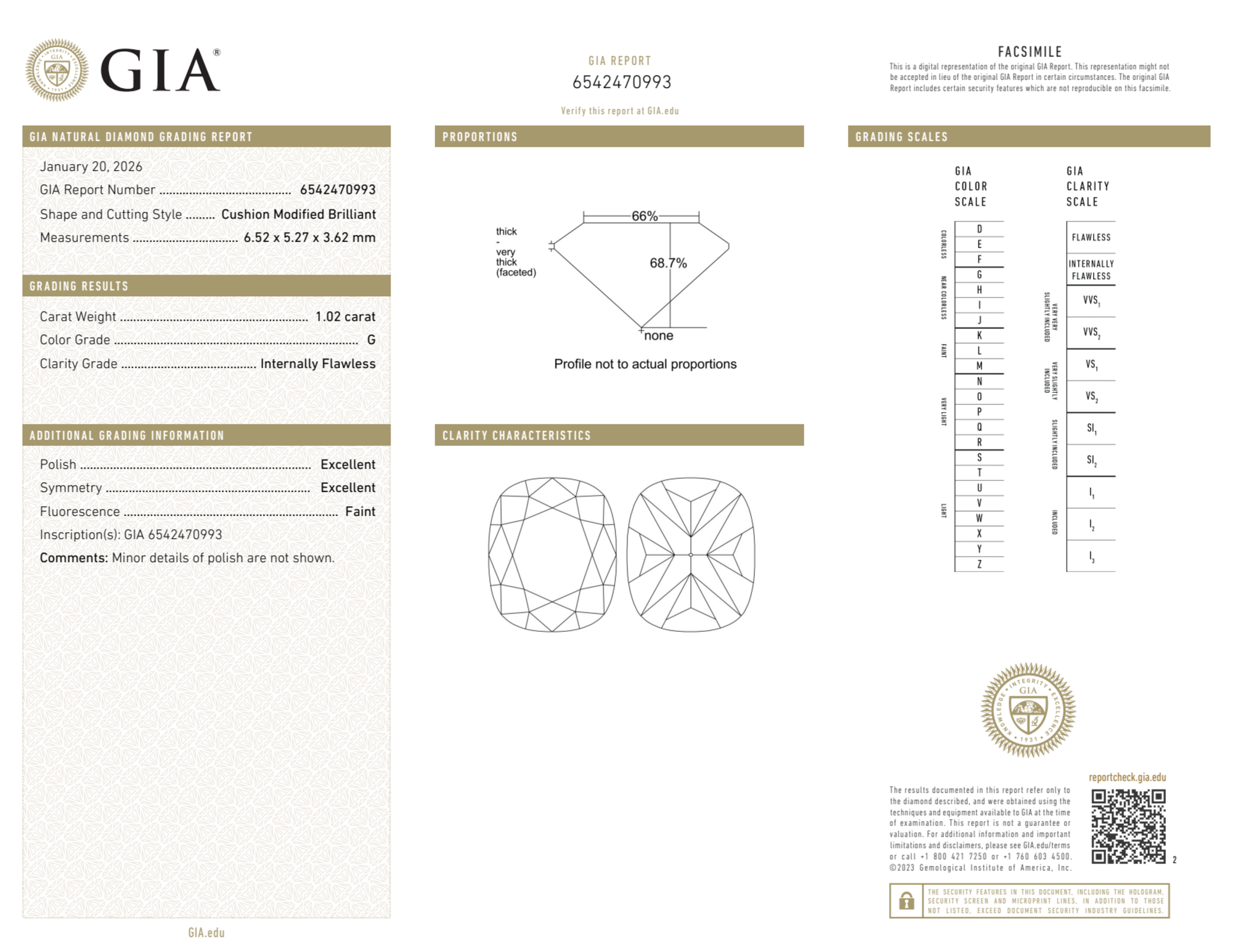 Your 1.02 carat Cushion natural diamond is graded G color (Near Colorless), and you can read more about G color diamonds here.