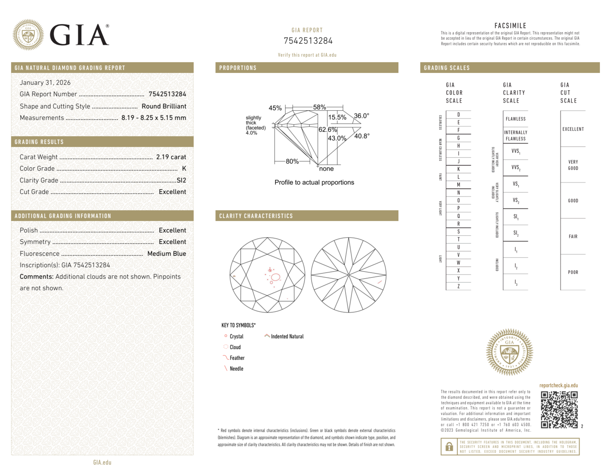 Your 2.19 carat Round natural diamond is graded SI2 clarity, which stands for Slightly Included 2. Read more about SI2 clarity diamonds here, or learn more about diamond clarity in general here.