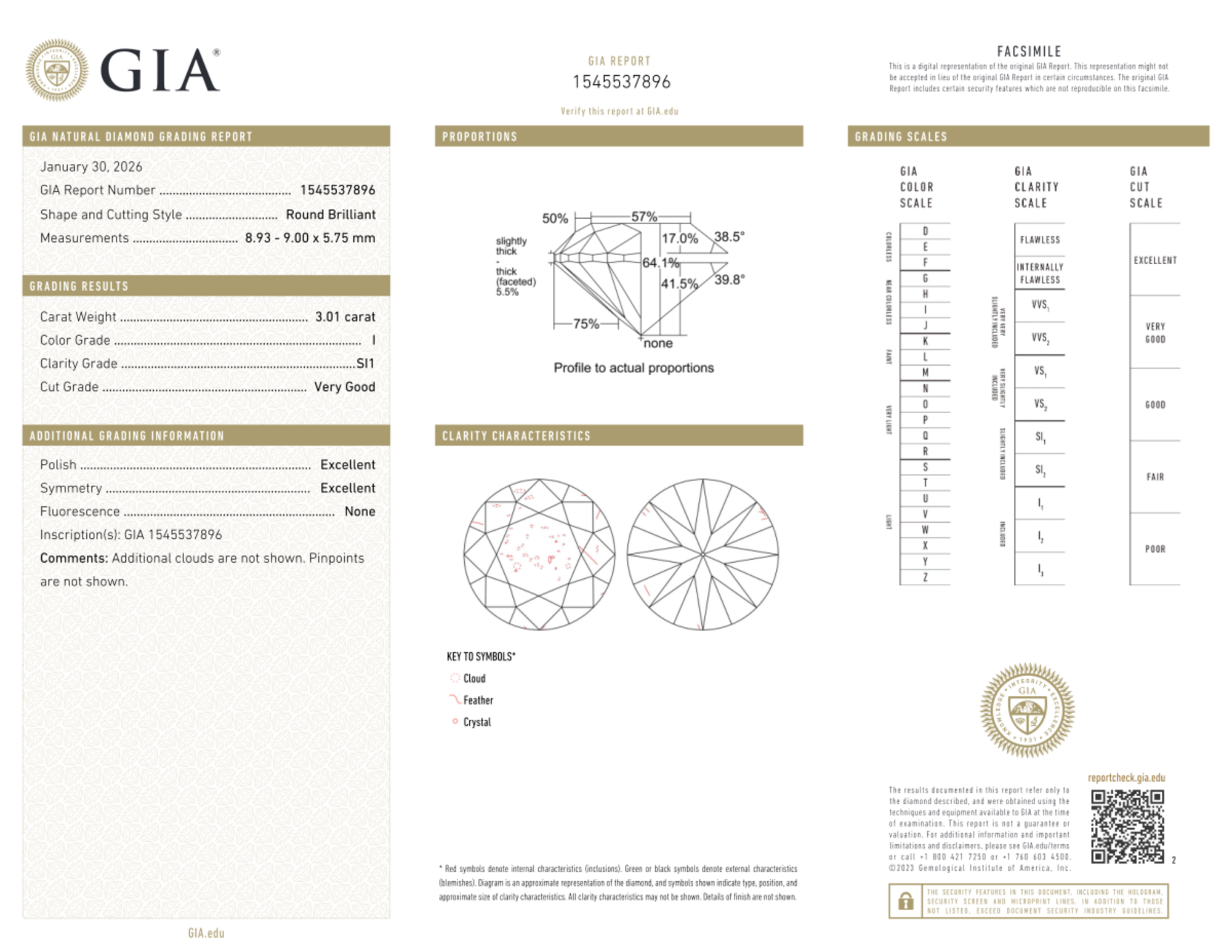 Your 3.01 carat Round natural diamond is graded SI1 clarity, which stands for Slightly Included 1. Read more about SI1 clarity diamonds here, or learn more about diamond clarity in general here.