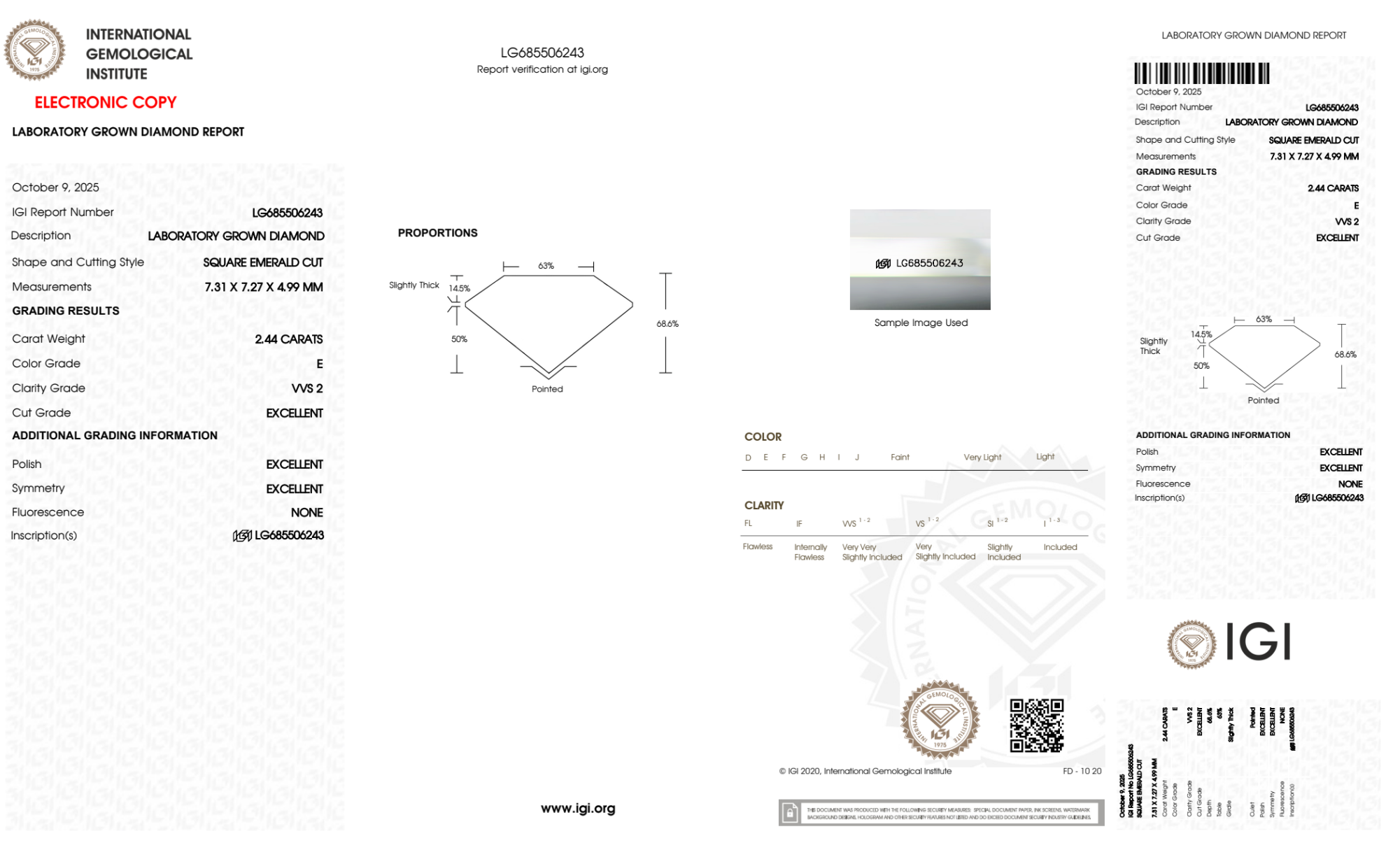 Your 2.44 carat Asscher lab diamond is graded E color (Colorless), and you can read more about E color diamonds here.