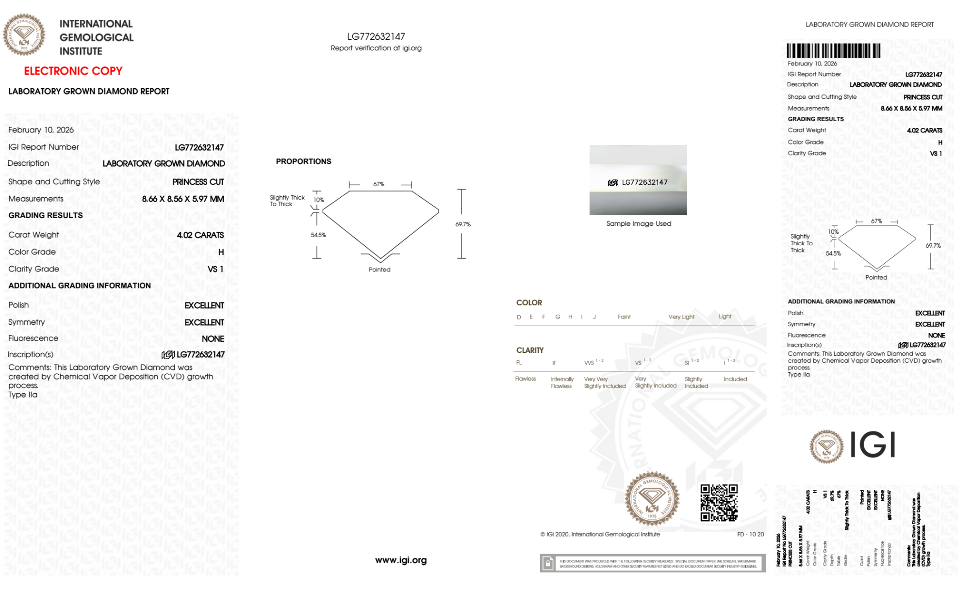 Your 4.02 carat Princess lab diamond is graded H color (Near Colorless), and you can read more about H color diamonds here.