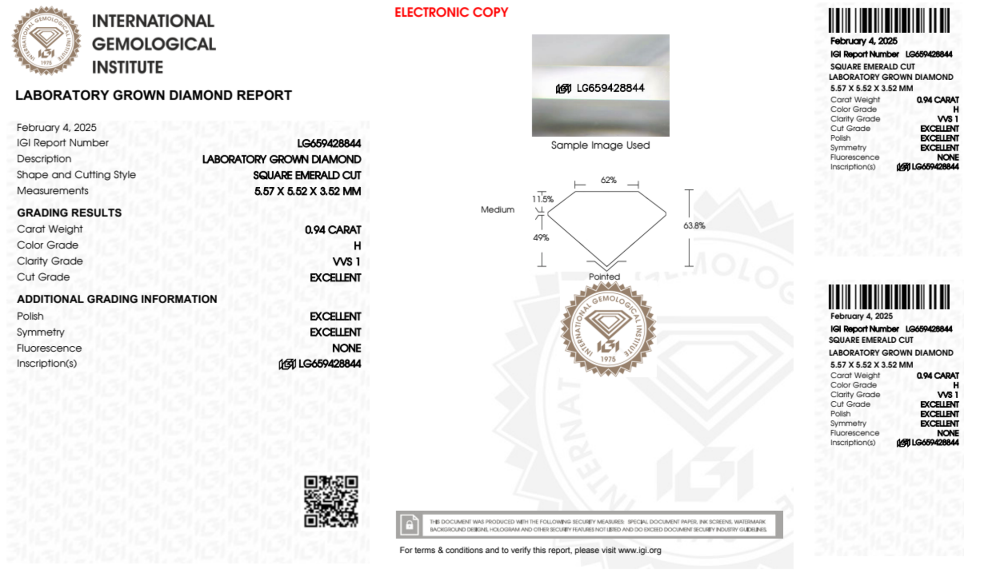 Your 0.94 carat Asscher lab diamond is graded H color (Near Colorless), and you can read more about H color diamonds here.