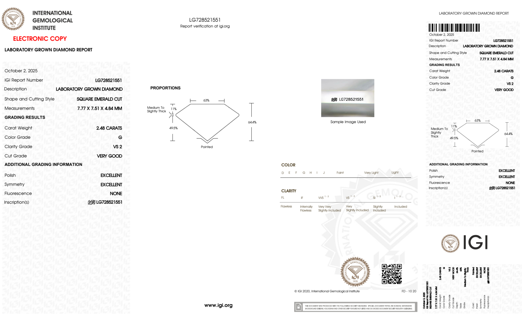 Your 2.48 carat Asscher lab diamond is graded G color (Near Colorless), and you can read more about G color diamonds here.