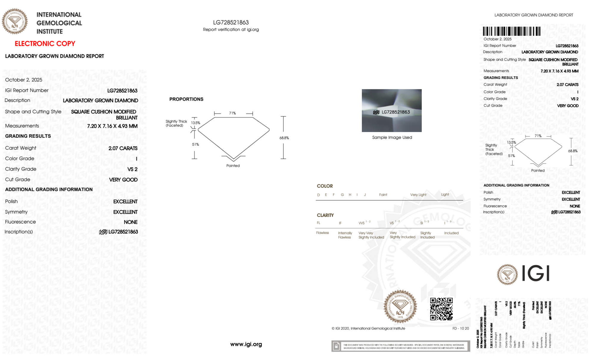 Your 2.07 carat Cushion lab diamond is graded I color (Near Colorless), and you can read more about I color diamonds here.