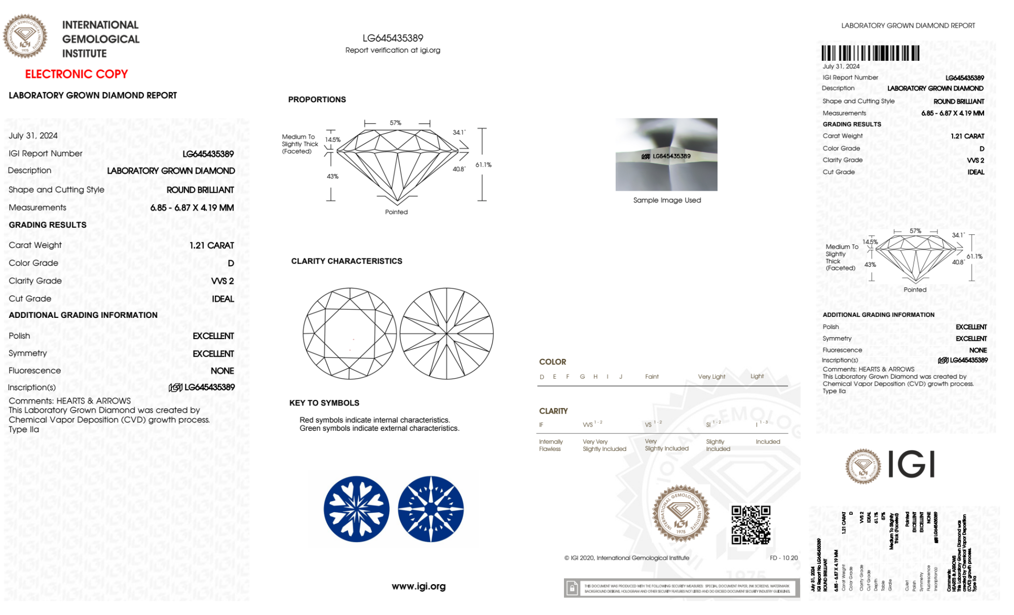 Your 1.21 carat Round lab diamond is graded D color (Colorless), and you can read more about D color diamonds here.