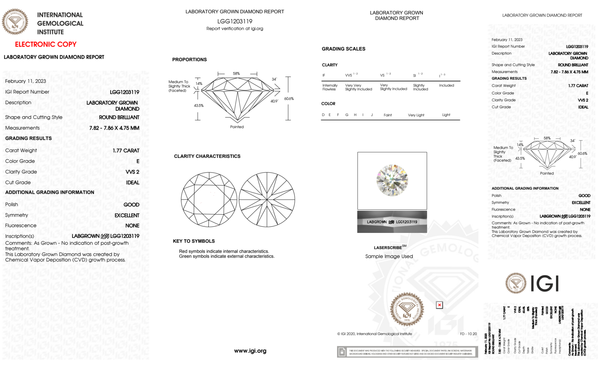 Your 1.77 carat Round lab diamond is graded E color (Colorless), and you can read more about E color diamonds here.