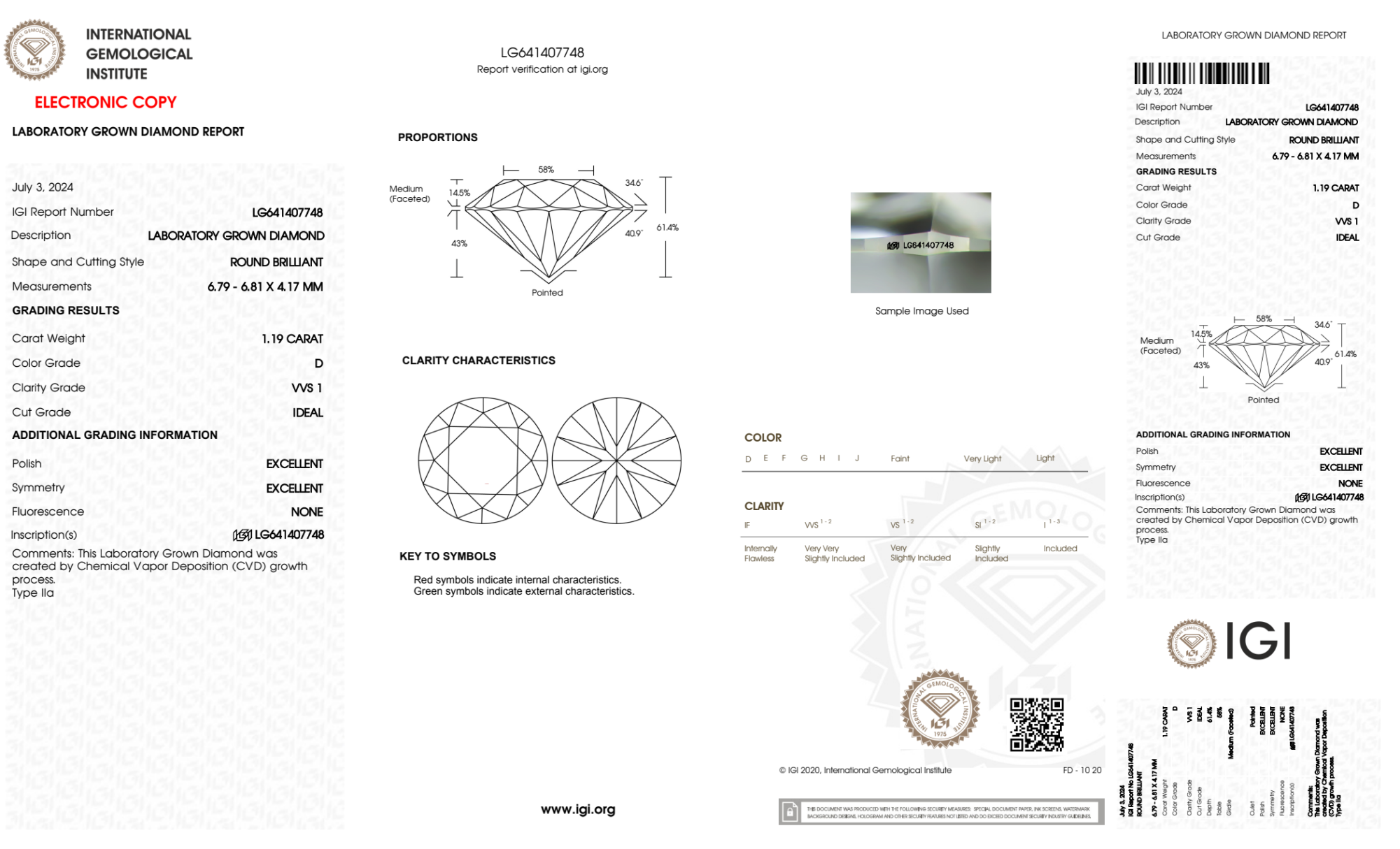 Your 1.19 carat Round lab diamond is graded D color (Colorless), and you can read more about D color diamonds here.
