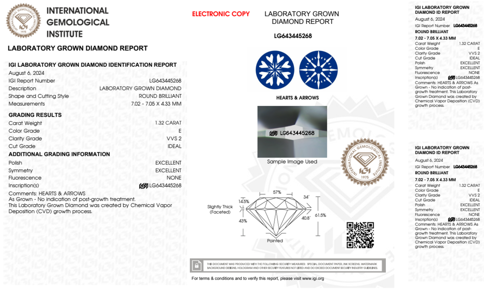Your 1.32 carat Round lab diamond is graded E color (Colorless), and you can read more about E color diamonds here.