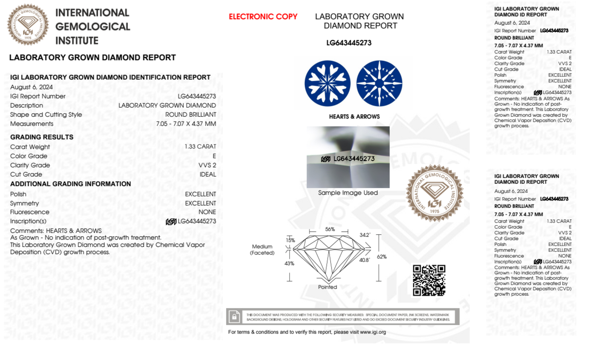Your 1.33 carat Round lab diamond is graded E color (Colorless), and you can read more about E color diamonds here.