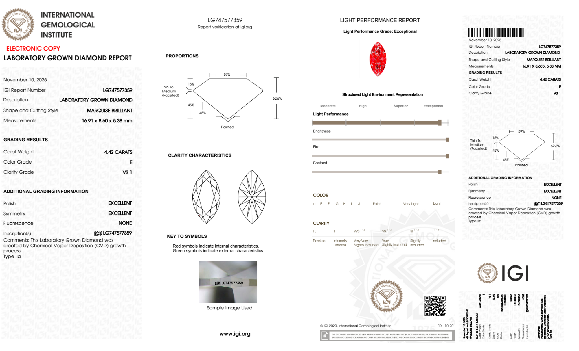 Your 4.42 carat Marquise lab diamond is graded E color (Colorless), and you can read more about E color diamonds here.