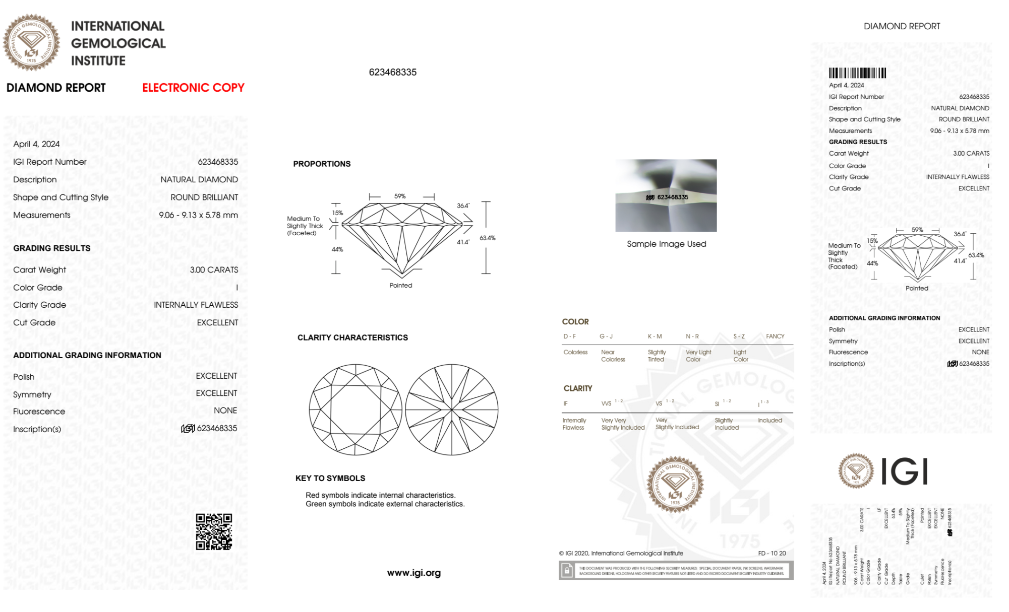 Your 3.00 carat Round natural diamond is graded IF clarity, which stands for Internally Flawless. Read more about IF clarity diamonds here, or learn more about diamond clarity in general here.